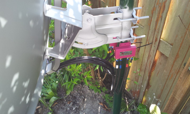 De kabels aan tafel aan de LNB gemonteerd, zelfvulkaniserende tape eromheen - en de LNB's geplaatst.