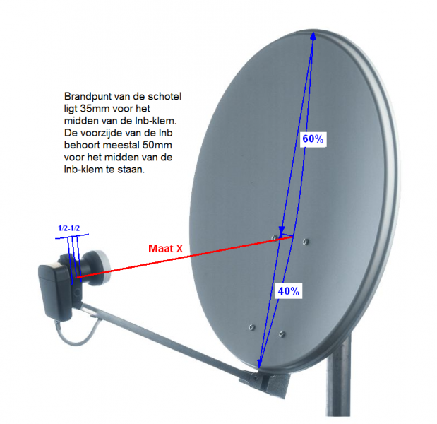 Sprietje Geplaatst: 31 maart 2015 Geplaatst: 31 maart 2015 Beste matataIk heb met het uitrekenen van de lnb-afstanden een foutje gemaakt. Ze moeten dichter bij elkaar staan en wel als volgt:tussen de Hotbird 13 en Astra 19,2 is 71mmtussen de Astra 19,2 en Astra 23,5 in 48mmtussen de Astra 23,5 en Astra 28,2 is 51mmd.w.z. gemeten aan de voorzijde van de lnb van kuiltje tot kuiltje.Je ziet dat de afstand tussen de Astra 19,2 en 23,5 kritisch is. De lnb is 56mm breed. Omdat ze 5 graden taps t.o.v. elkaar staan, komen de koppen dichter bij elkaar te staan dan die 56mm. Dat wordt 50mm. Dat is een afwijking van 2mm van wat het moet zijn maar dat is geen probleem. De ALPS-Quad-lnb's zijn dus wel te gebruiken.De schotel moet 9,74 graden schuin gezet worden, d.w.z. de kop van de Hotbird 13 moet met deze nieuwe berekening 29mm lager staan dan de kop van de Astra 28,2.