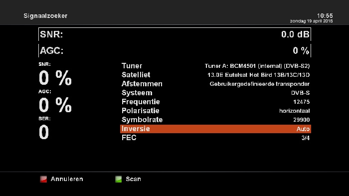 Sprietje Geplaatst: 19 april 2015 Geplaatst: 19 april 2015 Dan heb je waarschijnlijk een te zwak signaal door die SR van 29900.Zie de foto die ik zojuist genomen heb, klik.Ik ontvang de deze zender met een Triax 115 met multirail en Inverto Black Ultra Quad.