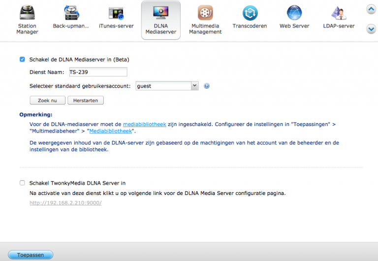 Jürgen Geplaatst: 27 juli 2015 Auteur Geplaatst: 27 juli 2015 Op dit moment heb ik het niet meer over Twonky Server maar over DLNA Server. Zoals ik gisteren schreef heb ik een WD patch geïnstalleerd die de Twonky Server heeft verwijderd en een DLNA Server heeft geïnstalleerd, zie bijlage, met het gevolg dat de Samsung TV nu wel met de NAS communiceert maar helaas enkele video formaten niet afspeelt. MacBook Air M2 2022 - iPad Air 2021 - Iphone XR - Apple TV 4 2021