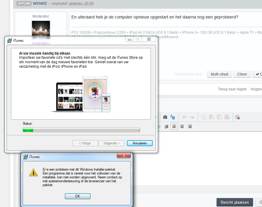 Gast catw Geplaatst: 11 oktober 2015 Geplaatst: 11 oktober 2015 iTunes op mijn windows computer geeft aan dat er een update is. Deze gedownload en bij het installeren kreeg ik een foutmelding, dit is eigenlijk voor het eerst. Gezien de melding ga ik er vanuit dat de fout bij apple zit, hier onder de versie welke op deze computer zit en daaronder de foutmelding van de nieuwe versie (zo probeer ik ze te uploaden).