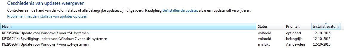 Gast catw Geplaatst: 12 oktober 2015 Geplaatst: 12 oktober 2015 (aangepast) Door een Windows fout, de updatefile KB:2952664 was mislukt, dus eerst naar windows en bij geinstalleerde software deze déinstalleren. Daarna winfows fix it draaien, opnieuw bij de update's naar KB:2952664 zoeken en installeren. Na de restart iTunes kunnen installeren! 12 oktober 2015 aangepast door catw