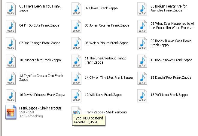 Zilverster Geplaatst: 24 maart 2016 Auteur Geplaatst: 24 maart 2016 Deel 3 Dan nu verder met deel 3, het eind doel : De afwerking om alles wat we hier boven gedaan hebben om de file geschikt te maken voor het afspelen op de Dune. Dit zonder pauzes tussen de tracks maar met behoud van de mogelijkheid om tracks te kunnen skippen. We gaan even terug naar deel 2, daar hebben we een map aangemaakt waar we het bestand hebben opgeslagen. Na de bewerking in deel 2 hebben we een bestand aangemaakt die bestaat uit 1 file met als naam Frank Zappa - Sheik Yerbouti en als extentie wave ( Frank Zappa - Sheik Yerbouti.wav ) . Deze file kan je ook afspelen zonder pauzes tussen de nummers, maar dat willen we niet. We willen kunnen skippen !!!!!! De aangemaakte map in deel 1 bestaat uit 18 losse nummers en 2 andere bestanden bestaande, uit een foto ( Frank Zappa - Sheik Yerbouti.jpg ) en een file met als naam Frank Zappa - Sheik Yerbouti ( Frank Zappa - Sheik Yerbouti.m3u ) : Als je de file Frank Zappa - Sheik Yerbouti ( Frank Zappa - Sheik Yerbouti.m3u ) opent in kladblok van Windows dan kun je daar de volgende gegevens lezen : #EXTM3U #EXTINF:215,Frank Zappa - I Have Been in You 01 I Have Been in You Frank Zappa.wav #EXTINF:402,Frank Zappa - Flakes 02 Flakes Frank Zappa.wav #EXTINF:223,Frank Zappa - Broken Hearts Are for Assholes 03 Broken Hearts Are for Assholes Frank Zappa.wav #EXTINF:189,Frank Zappa - I’m So Cute 04 I’m So Cute Frank Zappa.wav #EXTINF:170,Frank Zappa - Jones Crusher 05 Jones Crusher Frank Zappa.wav #EXTINF:33,Frank Zappa - What Ever Happened to All the Fun in the World 06 What Ever Happened to All the Fun in the World Frank Zappa.wav #EXTINF:316,Frank Zappa - Rat Tomago 07 Rat Tomago Frank Zappa.wav #EXTINF:33,Frank Zappa - Wait a Minute 08 Wait a Minute Frank Zappa.wav #EXTINF:170,Frank Zappa - Bobby Brown Goes Down 09 Bobby Brown Goes Down Frank Zappa.wav #EXTINF:165,Frank Zappa - Rubber Shirt 10 Rubber Shirt Frank Zappa.wav #EXTINF:236,Frank Zappa - The Sheik Yerbouti Tango 11 The Sheik Yerbouti Tango Frank Zappa.wav #EXTINF:110,Frank Zappa - Baby Snakes 12 Baby Snakes Frank Zappa.wav #EXTINF:211,Frank Zappa - Tryin’ to Grow a Chin 13 Tryin’ to Grow a Chin Frank Zappa.wav #EXTINF:332,Frank Zappa - City of Tiny Lites 14 City of Tiny Lites Frank Zappa.wav #EXTINF:224,Frank Zappa - Dancin’ Fool 15 Dancin’ Fool Frank Zappa.wav #EXTINF:197,Frank Zappa - Jewish Princess 16 Jewish Princess Frank Zappa.wav #EXTINF:250,Frank Zappa - Wild Love 17 Wild Love Frank Zappa.wav #EXTINF:757,Frank Zappa - Yo’ Mama 18 Yo’ Mama Frank Zappa.wav Dan openen we nu uit deel 2 de map die we daar hebben opgeslagen, zie onder : Hier in staan 2 files, Frank Zappa - Sheik Yerbouti.cue ( Deze kan je laten staan, maar hebben we niet nodig voor de Dune ) en Frank Zappa - Sheik Yerbouti.wav . Deze laatste is dus een volledige wave file die we gemaakt hebben van de losse files uit deel 1. We kopiëren nu de file Frank Zappa - Sheik Yerbouti.m3u die we gemaakt hebben in deel 1 naar de map die we gemaakt hebben in deel 2 ( zie de laatste foto van hier boven ) . Tot zo ver deze uitleg, volgt hier onder nog even wat verdere info : Hier boven heb ik onderstaande gegevens geplaatst uit de .m3u bestand die aangemaakt is door het programma : >>>>>>>>>>>>>>>>>>>>>>>>>>>>>>>>>>>>>>>>>>>>>>>>>>>>>>>> #EXTM3U #EXTINF:215,Frank Zappa - I Have Been in You 01 I Have Been in You Frank Zappa.wav #EXTINF:402,Frank Zappa - Flakes 02 Flakes Frank Zappa.wav #EXTINF:223,Frank Zappa - Broken Hearts Are for Assholes 03 Broken Hearts Are for Assholes Frank Zappa.wav #EXTINF:189,Frank Zappa - I’m So Cute 04 I’m So Cute Frank Zappa.wav #EXTINF:170,Frank Zappa - Jones Crusher 05 Jones Crusher Frank Zappa.wav #EXTINF:33,Frank Zappa - What Ever Happened to All the Fun in the World 06 What Ever Happened to All the Fun in the World Frank Zappa.wav #EXTINF:316,Frank Zappa - Rat Tomago 07 Rat Tomago Frank Zappa.wav #EXTINF:33,Frank Zappa - Wait a Minute 08 Wait a Minute Frank Zappa.wav #EXTINF:170,Frank Zappa - Bobby Brown Goes Down 09 Bobby Brown Goes Down Frank Zappa.wav #EXTINF:165,Frank Zappa - Rubber Shirt 10 Rubber Shirt Frank Zappa.wav #EXTINF:236,Frank Zappa - The Sheik Yerbouti Tango 11 The Sheik Yerbouti Tango Frank Zappa.wav #EXTINF:110,Frank Zappa - Baby Snakes 12 Baby Snakes Frank Zappa.wav #EXTINF:211,Frank Zappa - Tryin’ to Grow a Chin 13 Tryin’ to Grow a Chin Frank Zappa.wav #EXTINF:332,Frank Zappa - City of Tiny Lites 14 City of Tiny Lites Frank Zappa.wav #EXTINF:224,Frank Zappa - Dancin’ Fool 15 Dancin’ Fool Frank Zappa.wav #EXTINF:197,Frank Zappa - Jewish Princess 16 Jewish Princess Frank Zappa.wav #EXTINF:250,Frank Zappa - Wild Love 17 Wild Love Frank Zappa.wav #EXTINF:757,Frank Zappa - Yo’ Mama 18 Yo’ Mama Frank Zappa.wav <<<<<<<<<<<<<<<<<<<<<<<<<<<<<<<<<<<<<<<<<<<<<<<<<<<<<<<< Mocht je zelf een .m3u bestand willen dan maken kan het ook iets eenvoudiger. De Dune kan hier ook goed mee omgaan : >>>>>>>>>>>>>>>>>>>>>>>>>>>>>>>>>>>>>>>>>>>>>>>>>>>>>>> #EXTM3U 01 I Have Been in You Frank Zappa.wav 02 Flakes Frank Zappa.wav 03 Broken Hearts Are for Assholes Frank Zappa.wav 04 I’m So Cute Frank Zappa.wav 05 Jones Crusher Frank Zappa.wav 06 What Ever Happened to All the Fun in the World Frank Zappa.wav 07 Rat Tomago Frank Zappa.wav 08 Wait a Minute Frank Zappa.wav 09 Bobby Brown Goes Down Frank Zappa.wav 10 Rubber Shirt Frank Zappa.wav 11 The Sheik Yerbouti Tango Frank Zappa.wav 12 Baby Snakes Frank Zappa.wav 13 Tryin’ to Grow a Chin Frank Zappa.wav 14 City of Tiny Lites Frank Zappa.wav 15 Dancin’ Fool Frank Zappa.wav 16 Jewish Princess Frank Zappa.wav 17 Wild Love Frank Zappa.wav 18 Yo’ Mama Frank Zappa.wav <<<<<<<<<<<<<<<<<<<<<<<<<<<<<<<<<<<<<<<<<<<<<<<<<<<<< Mocht je de gemaakte file willen afspelen open dan niet de .m3u file in de map, maar open de .wav file Na het openen van de .wav file ( gebruik knop play van de afstand bediening ) heb je 2 opties om te selecteren hoe je e.e.a. op het sche