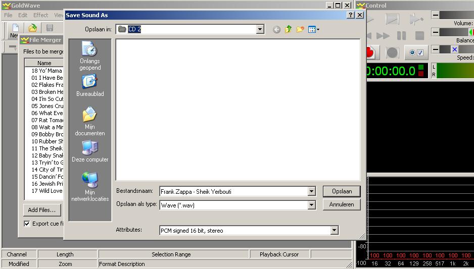 Zilverster Geplaatst: 24 maart 2016 Auteur Geplaatst: 24 maart 2016 Deel 2 Het is de bedoeling om nu een goed werkende audio file te maken die geschikt is om af te kunnen spelen op de Dune, zonder pauzes maar met behoud van de mogelijkheid om nummers te kunnen skippen. In deel 2 maken we gebruik van het programma GoldWave. Open het programma Goldwave en ga naar de optie Tool, klik deze aan met de linkermuis toets en selecteer de optie File merger : Het volgende scherm zal verschijnen : Selecteer de optie “Add files” met de linkermuis toets. Haal de bestanden uit de map die je hebt opgeslagen met behulp van het programma Exact Audo Copy uit deel 1 : Selecteer met behulp van de muis track 1 t/m 18 en selecteer met behulp van je linkermuis toets de optie Openen. Alle 18 bestanden worden nu geopend, je krijgt dan onderstaand resultaat : Alle files die we willen hebben staan er nu in. Vink de optie “Expert cue file” aan, het voordeel is dat er dan een Cue file voor dit bestand wordt aangemaakt en opgeslagen. Dit kan handig zijn voor andere media spelers die wel overweg kunnen met een Cue file. Deze file is geen vereiste voor de Dune media spelers, die kunnen niet overweg met deze extensie. Het kan altijd handig zijn om de gegevens die hier in staan te gebruiken voor het maken van een .m3u bestand die we nodig zijn voor het goed functioneren van de Dune media speler ! ( Dit gedeelte wordt besproken in deel 3 ) . Selecteer met je linkermuis toets de optie “Merge” : Er opent een nieuw scherm “Save Sound As” . Selecteer hier de map waarin je het bestand wilt opslaan ( in mijn geval CD 2 genaamd ) . Er zijn ook nog verschillende opties hoe je het bestand wilt opslaan, in ons geval gebruiken de vorm Wave !!!! Als je dat gedaan hebt selecteer de optie “Opslaan” doormiddel van je linkermuis toets. Het programma begint nu te schrijven, dit kan een tijdje in beslag nemen. Wanneer het gehele bestand is over gezet krijg je onderstaand scherm te zien : Einde deel 2 Gr. Zilverster. You are "The last in line" - Ronnie James Dio R.I.P.