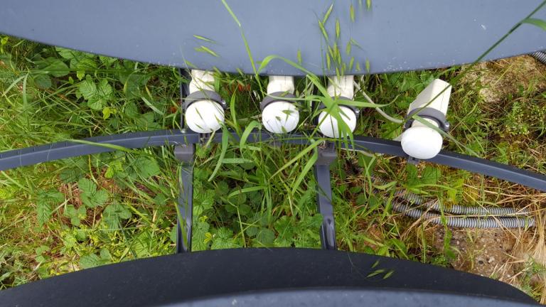 Namelijk daar waar de beugels die hoofd en subreflector samen houden onder de LNB rail lopen.