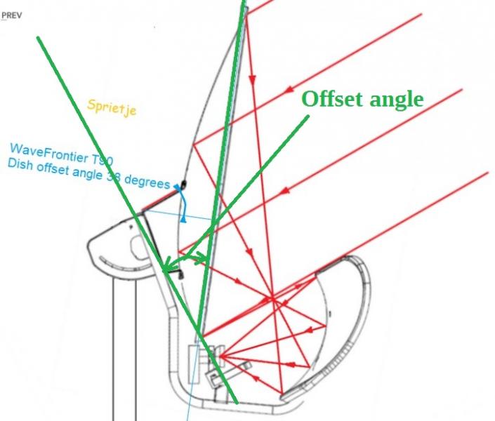 De elevatie van de T90 meet je op de schuine zijden aan de achterkant van de schotel, zie afbeelding.