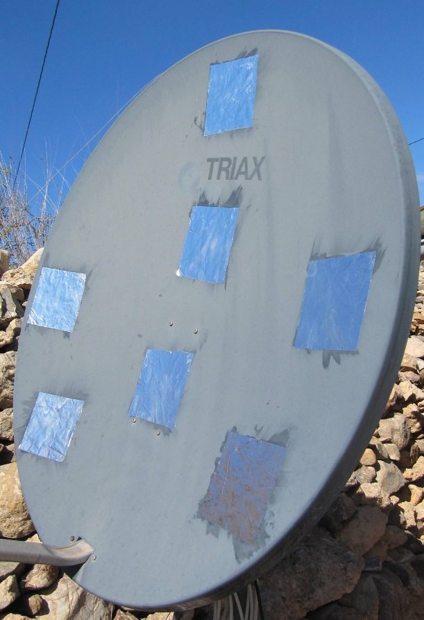 Sprietje Geplaatst: 6 oktober 2018 Geplaatst: 6 oktober 2018 (aangepast) Folie op schotel geplakt om belichting op lnb's te zien. Vandaag op diverse plaatsen stukken aluminiumfolie met gel op waterbasis op de schotel geplakt. Het is nog 2 dagen voor de maximale sun outage. Op de foto niet te zien maar met het oog wel dat de lnb nog onder het midden van de lnb het sterkst wordt belicht. Niet verwonderlijk omdat de zon nu nog ongeveer 1 graad te hoog aan de hemel staat. Helaas kan het contrast tussen fel verlicht en gewoon verlicht op een foto bij lange na niet weergegeven worden wat met het oog zichtbaar is waardoor het lijkt alsof de zon niet duidelijk op die ene lnb schijnt. Het blijkt dat toen de schotel nieuw was en de lak nog enigszins glans had, het zonlicht beter gebundeld werd dan nu. Je kunt ook zien dat het folie niet glad genoeg op de schotel zit maar beter kreeg ik het er niet op. 6 oktober 2018 aangepast door Sprietje