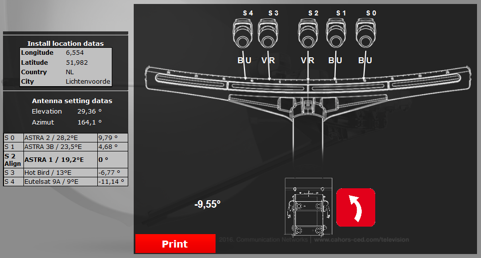 Sprietje Geplaatst: 29 oktober 2016 Geplaatst: 29 oktober 2016 Dit is dus je ideale schotel afstelling, zie bijlage.Schotelskew op 9,55 graden.In de afbeelding heb ik aangegeven waar je de Black Ultra en waar je de Venton Rocket moet plaatsen, BU en VR.Tussen de Astra 23,5 en Astra 28,2 kom je een millimeter te kort.De Astra 23,5 stel je af op positie 4,68, de Astra 28,2 iets verder dan 9,79 dus ergens op 9,8.... Dit is ook het beste want de 28,2e positie ligt voor de drie satellieten 2E, 2F, 2G niet op 28,2 maar op 28,35e.De Hotbird precies op -6,77 afstellen en de 9e iets verder dan -11,14 want die grote feedhorn vangt de signalen toch wel.Astra 23,5 op 4,68 is dus 4 hele strepen plus 7,7mmHotbird 13 op -6,77 is dus 6 hele strepen plus 8,8mmEn heel belangrijk, de schotel echt optimaal op de Astra 19,2 afstellen want doe je dat niet prcies genoeg, dan lijden daar de overige satellieten ook onder.Een Inverto Black Ultra bestaat alleen in zwart.Een Inverto Multiconnect is wit.