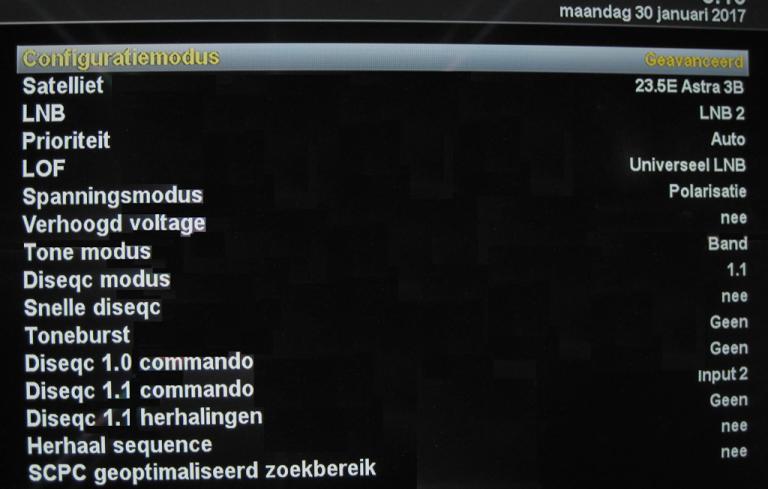 RvdG Geplaatst: 12 januari 2017 Geplaatst: 12 januari 2017 Hallo iedereen. Ben mijn schotel 4/1 aan het ombouwen naar twee schotels (triax 88) met EMP-Centauri S8/1PCP-W2 DiSEqC switch voor 8 satellieten. Mijn vraag is wat zijn de juiste instellingen bij instellingen in Dreambox 800 HD SE? Had een foto gemaakt ervan, maar weet niet te uploaden dus dan maar de txt-versie hieronder. Confederatiemodus: Geavanceerd Satelliet: 19.2 E Astra KU Band LNB: LNB 3 Prioriteit: Auto LOF : Universeel LNB Spanningsmodus: Polarisatie Verhoogd voltage: Nee Tone Modus: Band Diseqc Modus: 1.1 Snelle diseqc: Nee Toneburst: Geen Diseqc 1.0 commando: Geen Diseqc 1.1 commando: Input 3 Diseqc 1.1 herhalingen: Geen Herhaal Sequence: Nee SCPC geoptimaliseerd zoekbereik: Nee Alle inputs en satellieten volgen dezelfde nrs. Dus LNB 1 = Input enz Hoop dat er iemand kan helpen, want ik kom niet verder dan het zien van de 19.2. Groet en alvast heel erg bedankt. (toch gelukt met foto alleen niet zo scherp)