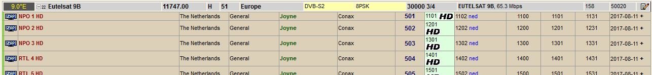 Sprietje Geplaatst: 21 september 2017 Geplaatst: 21 september 2017 Beste Sanyu SR = Symbol Rate en dat staat bij jou aangegeven als Baudrate. De fec (foutcorrectie) hoef je bij moderne ontvangers niet meer in te vullen. Dat vindt de onvanger zelf wel. Om de Eutelsat 9 te vinden, kun je zeker het beste genoemde transponder gebruiken en dat is een DVB-S transponder. In Emmerich moet de elevatie van de schotel op 30,7 graden staan om de Eutelsat 9 te vinden. De lnb moet gewoon recht staan dus skew op nul (coaxaansluiting recht omlaag). Als het je niet lukt deze transponder te vinden, dan morgen de schotel maar eens uitrichten m.b.v de zon. Om 13:17uur staat de zon precies in de richting van de satelliet. Eenmaal de Eutelsat 9 gevonden, dan de transponders van Joyne inladen. Eerst transponder 11747H, DVB-S2, 8PSK, SR 30.000, fec 3/4 daarna transponder 12074V, DVB-S2, 8PSK, SR 30.000, fec 3/4.