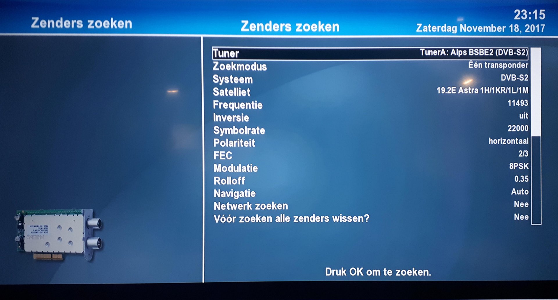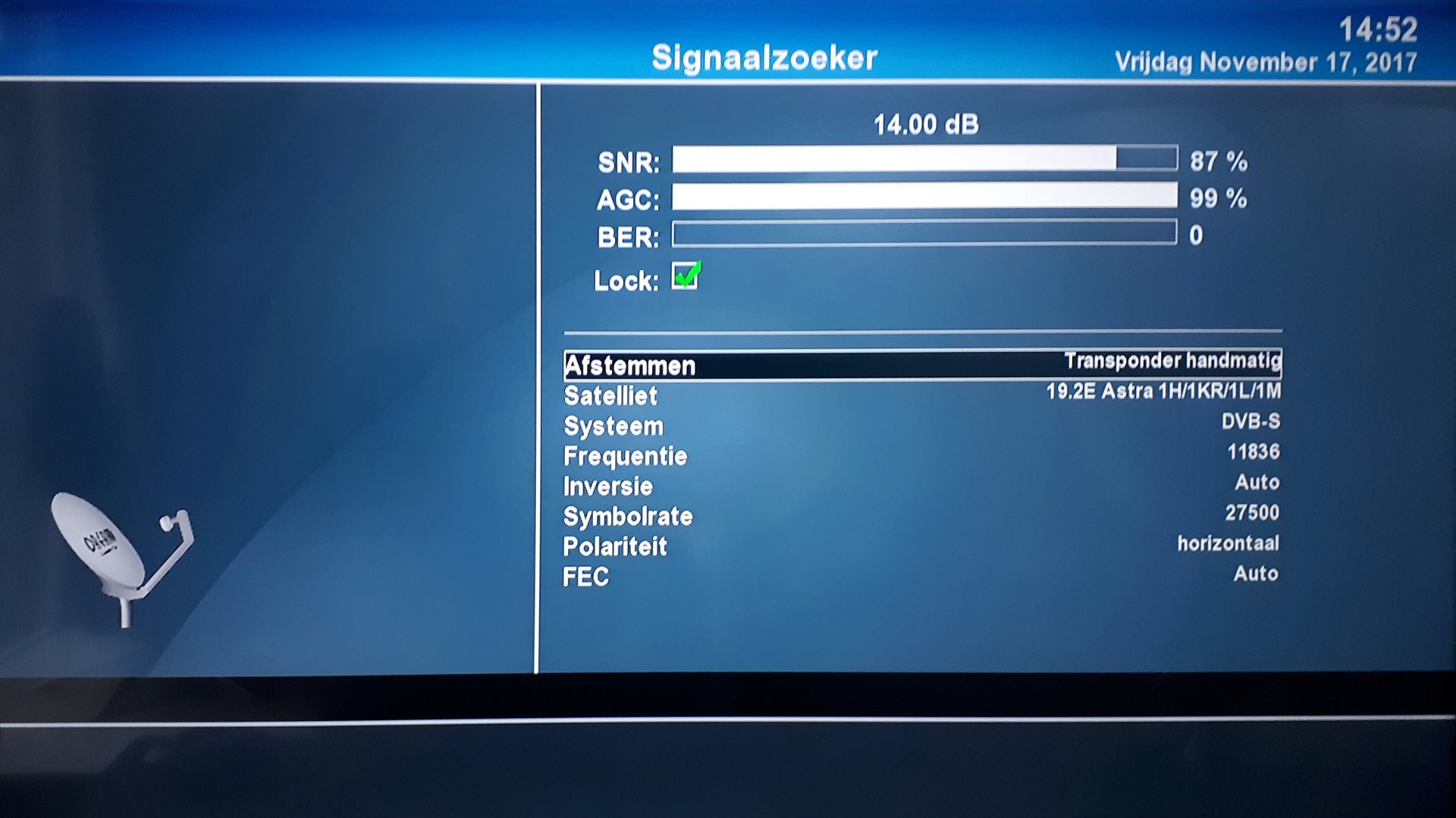 Bert42 Geplaatst: 18 november 2017 Auteur Geplaatst: 18 november 2017 Dit is mijn zeer beperkt zenderlijst. Behalve BVN zijn alle zenders horizontaal gepolariseerd. De kabel lengte is waarschijnlijk ca. 15 meter maar gezien de signaal sterkte is dat lijkt mij geen probleem. Wanneer ik Das Eerste HD kies krijg ik de mededeling "Afstemming mislukt". Ik heb alleen de SD kanalen in de lijst opgenomen en de beschikbare HD kanalen. Voor de rest kijken wij naar de kabel, Ziggo.