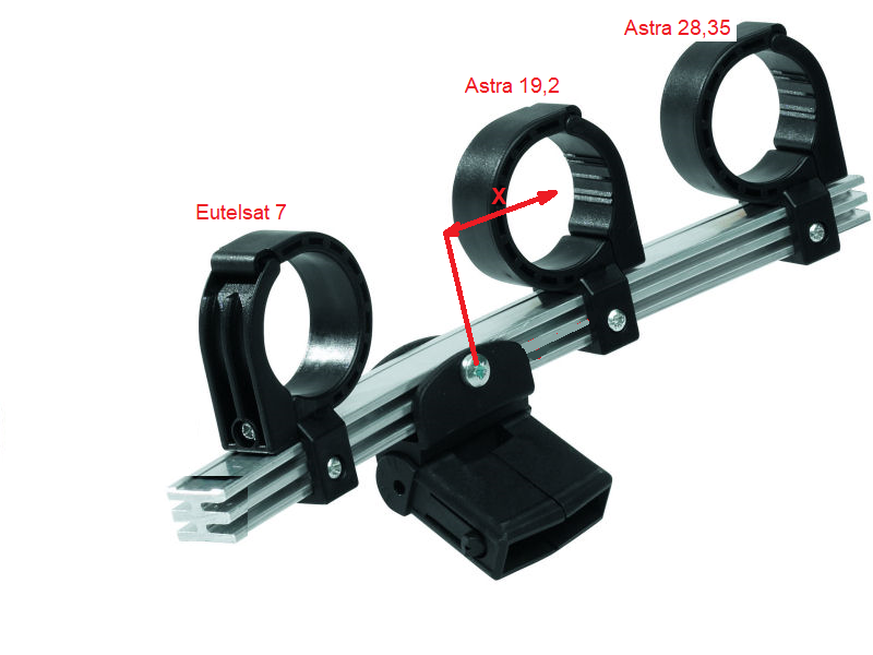 Sprietje Geplaatst: 19 december 2017 Geplaatst: 19 december 2017 (aangepast) Kijk, hier heb ik wat aan. Om te beginnen zou ik nooit een gewone offsetschotel hebben genomen om satellieten te ontvangen die zo ver uit elkaar staan. De 7e en 28,2e staan meer dan 23 graden ontvangsthoek uit elkaar en daarmee wordt de ontvangst van de twee buitenste satellieten verzwakt alsof je een schotel hebt kleiner dan een Triax 78. Beter was het geweest om een multifocus schotel te nemen, bijv. de Maximum E-85. Maar goed misschien dat het toch gaat lukken. Om te beginnen staat de schuinstand van de rail niet goed. Die moet 9,57° (afgerond 9,6°) schuin staat voor Tilburg om de 7e en 28e te ontvangen. Hierbij moet de 7e het laagst staan en de 28,35 het hoogste. Waarom de 28,23? De Astra 2-positie bestaat uit drie satellieten waarvan de posities liggen tussen de 28,2 oost en 28,5 oost, gemiddeld dus 28,35. Ook de verdeling van de lnb's op de rail moet je ander doen. De Digiturk zit op de Europa B-beam van de Eutelsat 7 en heeft in Tilburg veldsterkte van 50 dBW. De Astra 28,2 heeft in Tilburg een veldsterkte van 53,5dbW. De 7e moet je dus dichter in het midden plaatsen en de Astra 28,35 verder van het midden af. Je gebruikt de Eutelsat 16 als middelpunt. Je gaat de zaak als volgt afstellen. Monteer de rail zodat het gat in het midden in de onderste groef zit want met het gat boven kan de rail niet schuiner dan 7 graden. De afstanden van de drie lnb's moet je als volgt afstellen: - zet de rail 9,6° schuin. - zet de 19,2e-lnb 40mm links van het midden van de rail (maat X in de afbeelding) - plaats de 7e-lnb op 154mm rechts van de 19,2e-lnb - plaats de 28,35e-lnb op 115mm links van de 19,2e-lnb d.w.z van kuiltje tot kuiltje in de kap van de lnb gemeten. Om te controleren of je de schuinte van de rail goed hebt ingesteld: de Astra 28,35-lnb moet 44mm hoger staan dan de 7e-lnb Omdat je de Eutelsat 16 oost in het midden van de schotel ontvangt, moet je de elevatie van de schotel op ongeveer 30 graden ingesteld worden. De skew van de lnb's moeten als volgt afgesteld worden. 7 oost op 0 graden, dus aansluitingen recht omlaag. 19,2 oost op 4 graden 28,35 oost op 10 graden d.w.z. met de wijzers van de klok meegedraaid als je naar de binnenzijde van de schotel kijkt t.o.v. verticaal, niet t.o.v. de rail. Richt nu de schotel optimaal uit op de Astra 19,2, de twee andere satellieten ontvang je dan ook optimaal. Veel succes 19 december 2017 aangepast door Sprietje