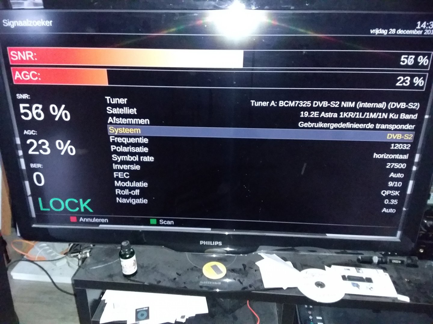 Kweenie Geplaatst: 30 maart 2018 Auteur Geplaatst: 30 maart 2018 27 minuten geleden zei a33: Krijg je wel signaal als je de hoogte in de oorspronkelijke stand terugzet? 17 minuten geleden zei a33: Huh? Je hebt een Xsarius easy pro, en je klaagt over een beperkt budget? Ik doe schotels afstellen altijd met een satfinder/satbeeper van 5 euro of zo, en een oude SD ontvanger met een zwart-wit TVtje die ik bij de schotel opstel. Als je weet hoe ze te gebruiken, zijn simpele middelen en gereedschappen vaak meer dan voldoende. Groet, A33 Die heb ik niet zelf maar iemand hier op de camping! 29 minuten geleden zei a33: Krijg je wel signaal als je de hoogte in de oorspronkelijke stand terugzet? Nee, want vanuit daar zijn we begonnen. 7 minuten geleden zei Sprietje: In Postel moet de elevatie van de schotel op 29,8 graden staan om de Astra 19,2 te vinden en deze waarde klopt alleen als de houder van de 19,2-lnb op de nul-positie staat. Verder moet de mast natuurlijk ook precies verticaal staan anders klopt de gradenstand op de schotel ook niet. Gaan we proberen! En ook een goed punt dat de mast waterpas moet staan!