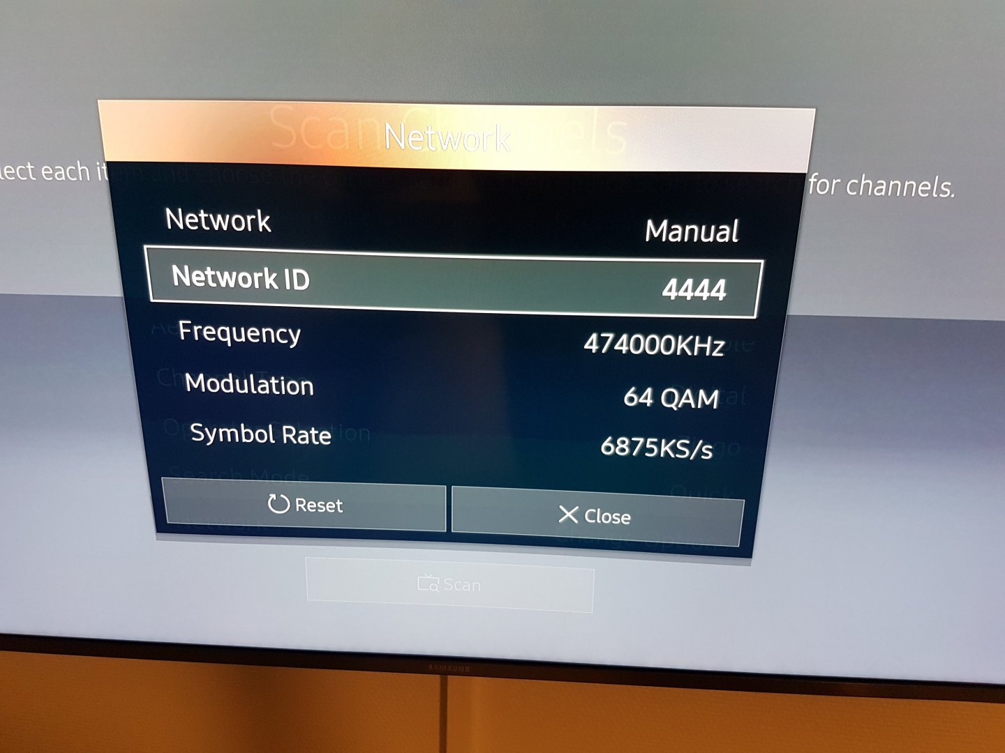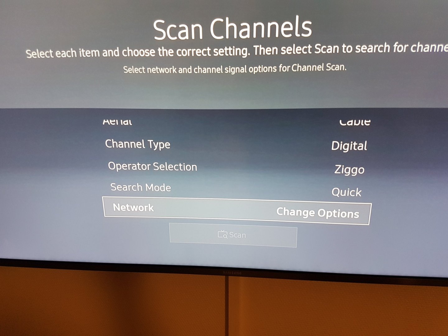 Die scan je in met Netwerkcode 4444 voor het standaard pakket zonder smartcard, of als je wel een smartcard hebt, gebruik je netwerkcode 5555   Aansluiten met een HDMI kabel natuurlijk, en even met het klein knopje op de afstandsbediening de beeld resolutie op 1080I of 1080P zetten = heel belangrijk.