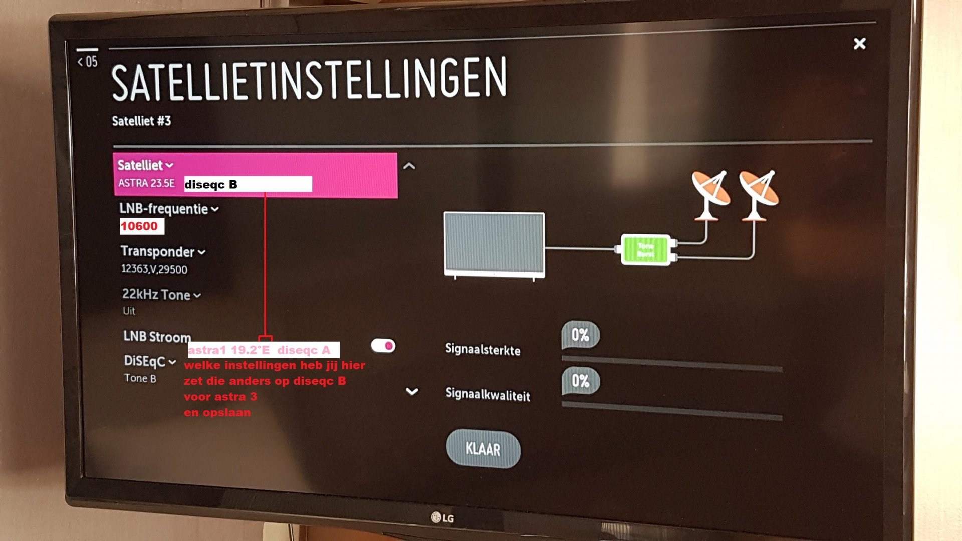 bbaardwijk Geplaatst: 5 mei 2018 Geplaatst: 5 mei 2018 Hallo, Ik heb vandaag geprobeerd om nieuwe aparatuur te installeren, voor het ontvangen van sateliet-tv. Helaas krijg ik op geen enkele manier een signaal te zien in zowel mijn tv, als op de satfinder. - schotel staat in de goede richting, uiteraard moet ik dat finetunen... Maar de meter staat echt op 0.0000 - TV is een LG 24 MT49S - LNB is een GT-MO3 Univ Monoblock (10.7 - 12.75Ghz) Ik heb heel veel verschillende varianten van de instellingen gebruikt.... Maar zonder succes. Op de foto een van de pogingen... De tv geeft vooraf de keuze voor canaldigitaal, lijkt daar ook voor geschikt. Het lijkt wel alsof er obv wat de tv geeft toch geen power op de lnb komt... Adviezen over de instellingen die ik nog zou kunnen proberen zijn welkom groeten, Bert