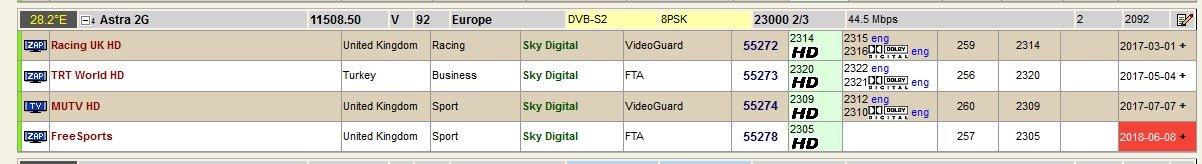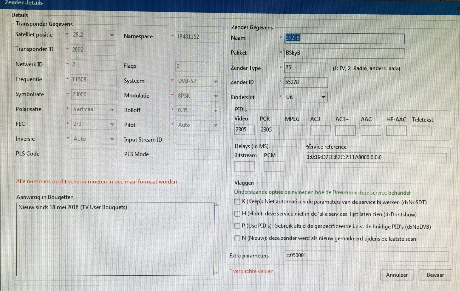 luisteraar Geplaatst: 13 juni 2018 Geplaatst: 13 juni 2018 (aangepast) Hier is alreeds gemeld eindeloos rondje Gewoon op de zender afstemmen dan menu->instellingen->zenders zoeken->handmatig zoeken->zoekmode gebruikersgedefinieerde transponde controleer of juiste transponder ingesteld is anders aanpassen en scannen dan kan je zien of de zender ueberhaubt ingelezen wordt. perfect beeld en geluid met de volgende instelling op de vantage 8000S: 11.509 V, 23.000, 2/3, DVB-S2, 8PSK 1920x1088 16:9 video H.264 videopid 2305 audio Mpeg 2 audio bitrate 192 audiopid 2306 PCR pid 2305 13 juni 2018 aangepast door luisteraar