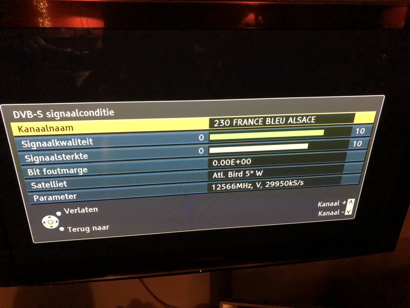 vandaag alle stappen doorlopen, 3 van de 4 satellieten pakken gelijk goed signaal maar helaas krijg ik op Eutelsat 5W geen signaal, wat ik ook probeer! ik heb met de skew van lnb en schotel lopen spelen maar helaas geen enkele waarneming zichtbaar, waar zou het aan kunnen liggen?? :(