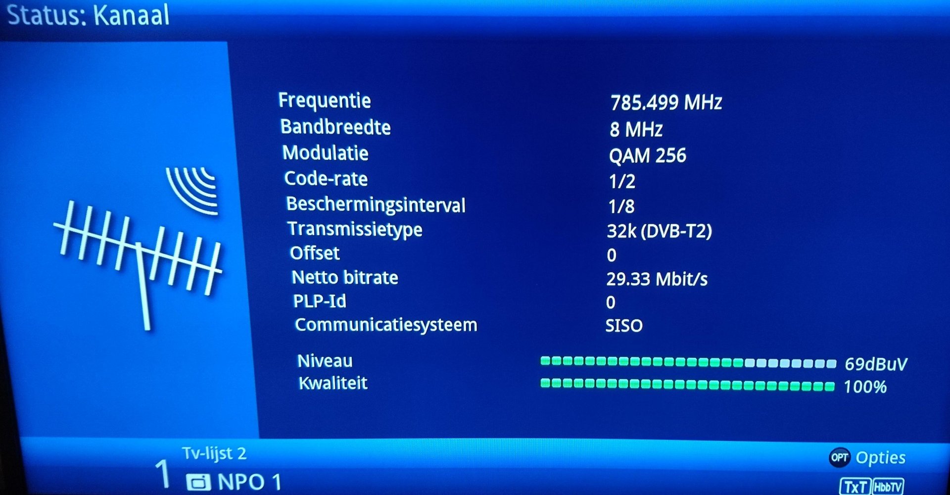Noordzee Geplaatst: 30 november 2018 Geplaatst: 30 november 2018 De beeldkwaliteit van DVB-T2 is vele malen beter dan het oude DVB-T. Ik kan het met de satelliet niet helemaal goed vergelijken, want via de satelliet kijk ik op een 4K televisie, terwijl ik hierboven in de hobbykamer een oude HD-ready TV heb staan. Maar ga er maar vanuit dat de beeldkwaliteit van DVB-T2 en DVB-S2 elkaar nu niet heel veel meer ontloopt. Echter wel met de kanttekening dat ik het nu over de NPO-zenders heb. Via Digitenne worden ook betaal-TV zenders doorgegeven via andere bouquetten en daar proppen ze 7 tot 8 zenders op 1 kanaal. Op het NPO-kanaal worden maar 5 TV-zenders doorgegeven. Geregistreerd lid Sat4All sinds : 6-6-2001 (oorspronkelijk 1-12-2000) Ontvanger : VU+ DUO 4K (Digitenne via DVB-T2 en FTA-zenders via DVB-S2X en streams) Schotel : Visiosat Bisat Ontvangst van : Astra 1, Astra 2, Astra 3 en Hot Bird