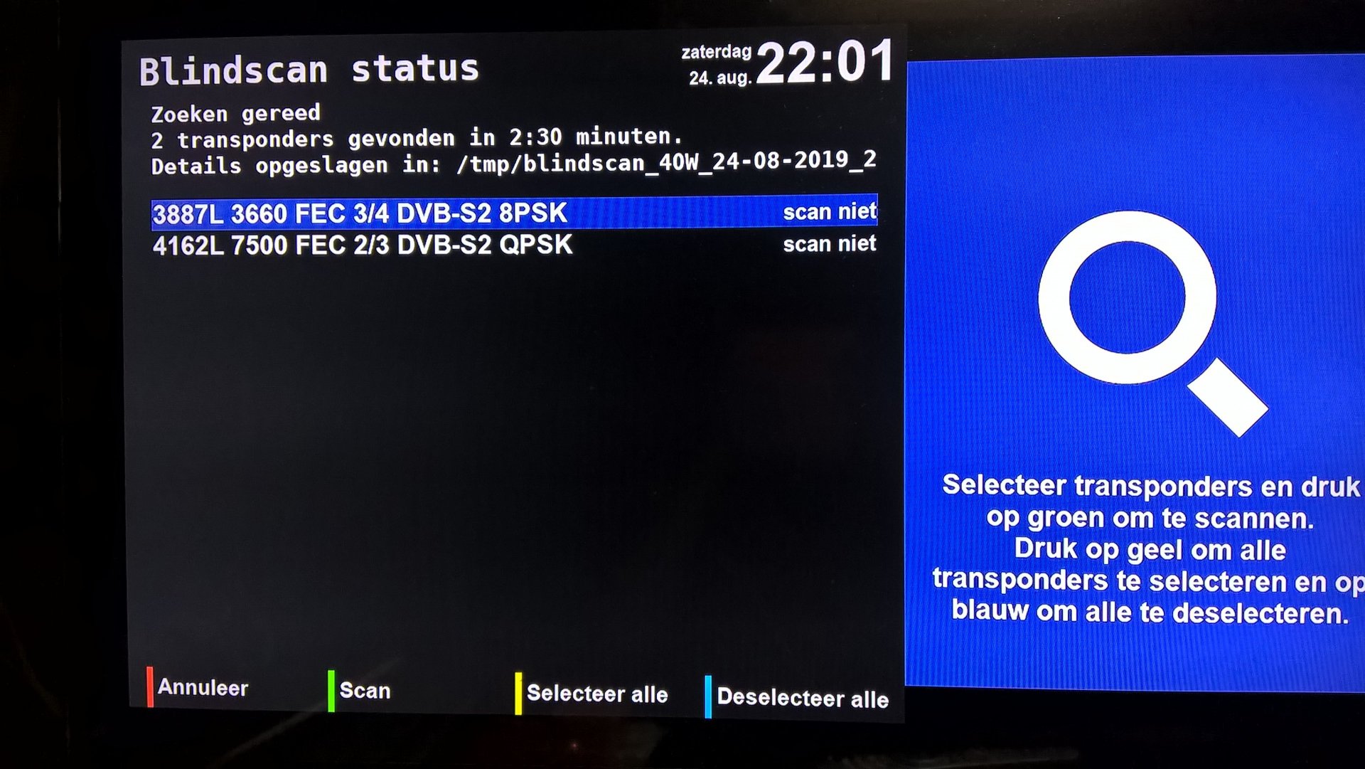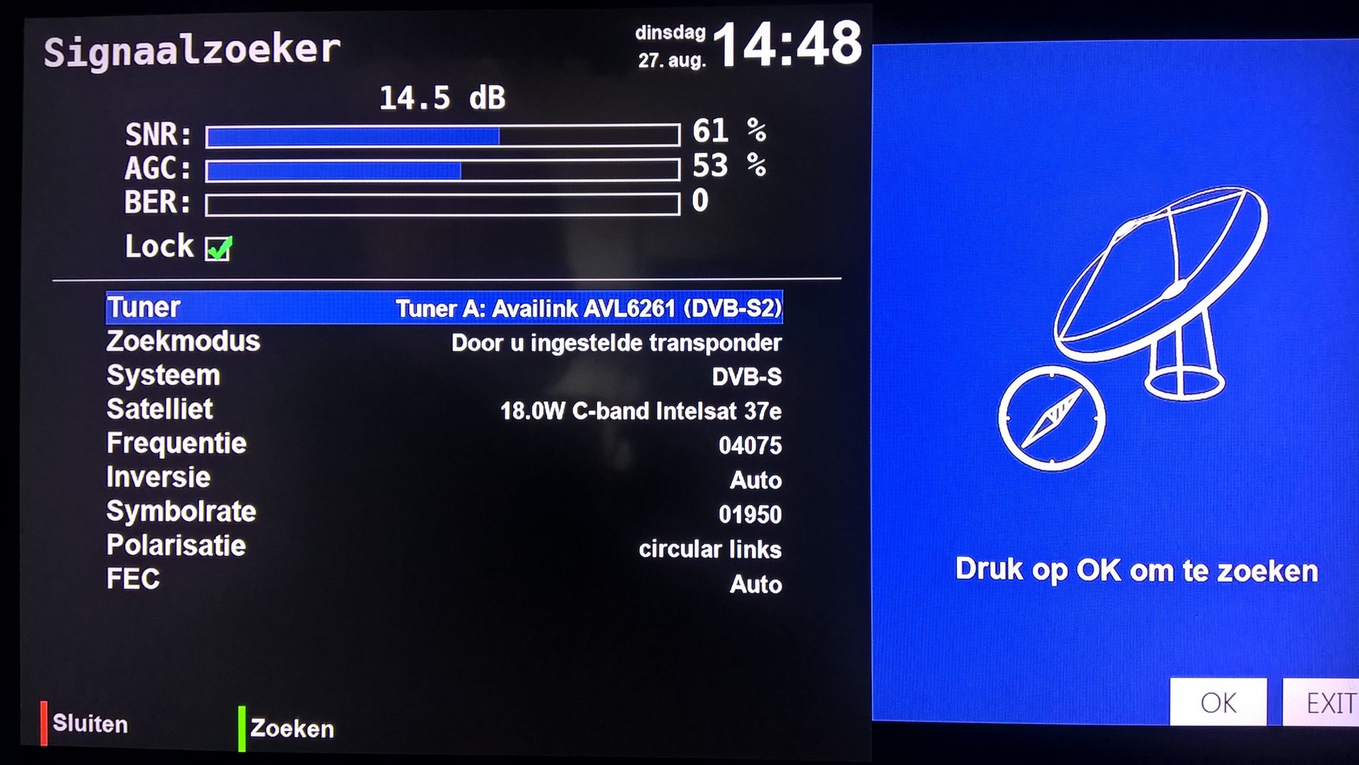 powersofts Geplaatst: 15 december 2018 Auteur Geplaatst: 15 december 2018 (aangepast) 58West : let niet op de foutieve satellietnaam van 47west. mijn ontvanger gaat niet verder dan 47w, dus zit ik op deze satellietpositie de transponders handmatig te checken. ik moet dat nog eens even uitzoeken of je met de hand in openpli 'new satellite' kunt toevoegen aan de lijst. Overigens is bovengenoemde transponder op 58West dan ook echt de enige waar ik signaal op krijg.... 68Oost: voor wat betreft het verder draaien dan 68oost, kan de schotel technisch draaien tot wel 70gr oost maar vanaf ca 68oost staan er bomen (op afstand) in de weg. Nu die bomen totaal kaal zijn is het een kwestie van gewoon eens proberen of er wat binnenkomt. vandaar dat ik op 68oost wil gaan beginnen met de sterkste transponder. 15 december 2018 aangepast door powersofts