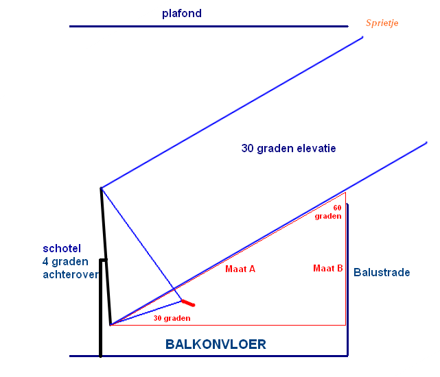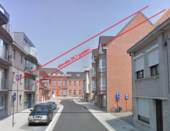 Sprietje Geplaatst: 22 februari 2019 Geplaatst: 22 februari 2019 (aangepast) Beste Hilario Je hebt de Astra 19,2 ingevoerd. Die staat op een elevatie van 29,7 graden in je woonplaats. Zoals je in de bijlage ziet, heb ik een schuine lijn onder een hoek van 29,7 graden getrokken vanaf het balkon op de eerste etage en dan blijkt dat door het spitse dak de nok van het huis toch te hoog is. Je ontvangt dus geen signaal. Je zou eigenlijk naar de tweede etage moeten verhuizen om wel ontvangst te hebben. Als het dak minder spits was geweest en je alleen rekening moest houden met de dakgoot, dan had het wel gegaan als je tenminste niet precies tegen zo'n dakkapel aan zit met de signalen. Dat noemen ze ook wel eens een koekoek heb ik begrepen maar ik weet niet of dat in België is. 22 februari 2019 aangepast door Sprietje