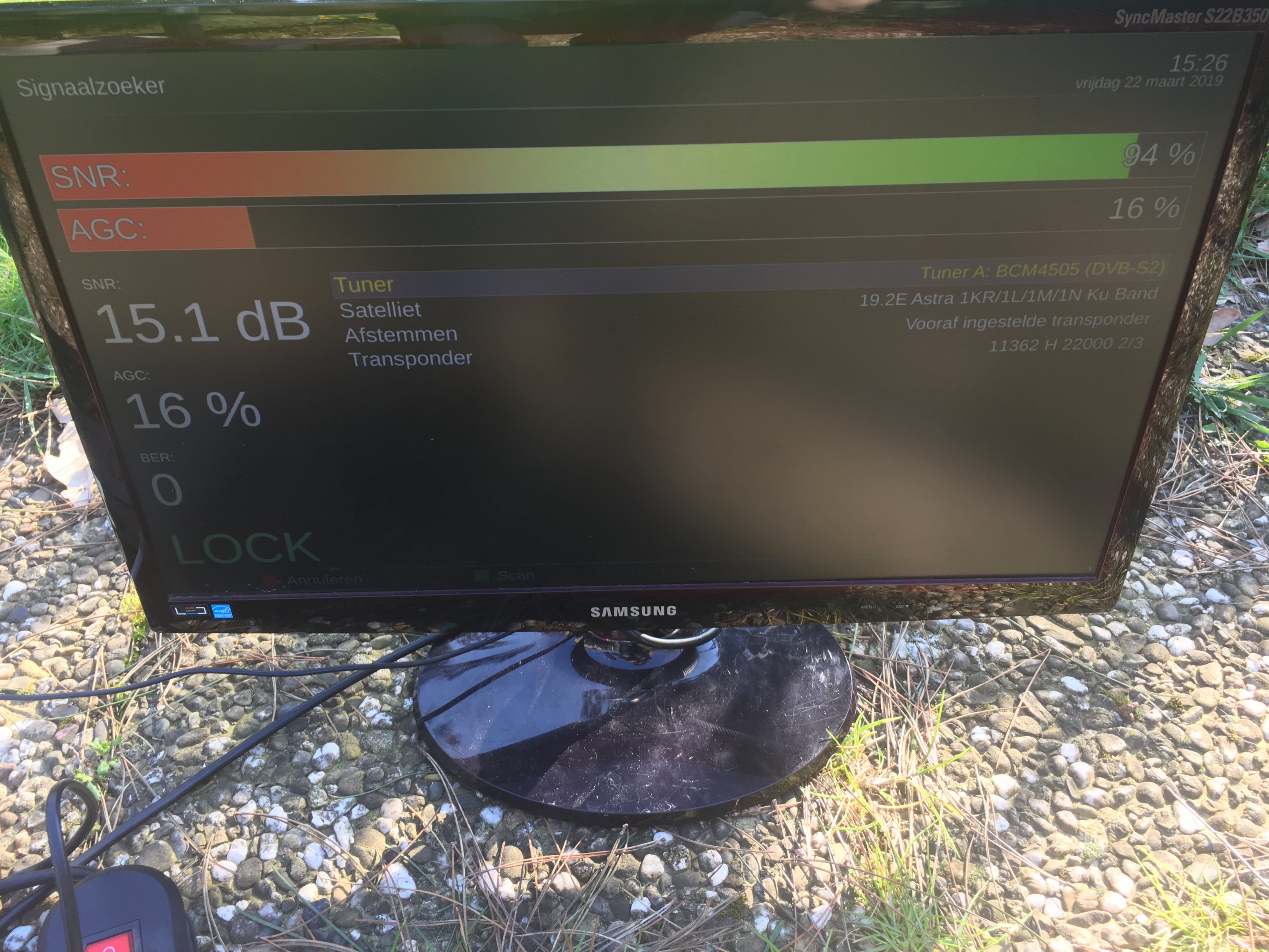 Glubbers Geplaatst: 22 maart 2019 Geplaatst: 22 maart 2019 Hallo medegebruikers van sat4all, Graag jullie hulp. Ik ben een week geleden verhuisd. Op het oude adres ( hemelsbreed 150 meter van het nieuwe adres) had ik een werkende setup met astra 1 en astra 3 Nu ben ik vandaag al de hele middag bezig met het uitrichten van de schotel maar ik krijg het niet voor elkaar. Ik heb een monoblock en astra 3 zit in de klem. Helaas krijg ik nul comma nul signaal er op Astra 1 krijg ik echter een signaal kwaliteit van: SNR: 94% + SNR: 15,1 dB en AGC: 16% Elevatie is volgens de schotel nu tussen 28 en 30 graden. Ik heb de app van cahors gebruikt. Deze geeft aan 28,44 graden elevatie. 157,8 graden aizmuth. Volgens de app heb ik de schotel precies goed staan maar nog steeds geen signaal Wie o wie kan mij het verlossende antwoord geven waarom ik totaal niet astra 3 kan vinden wat ik ook probeer.