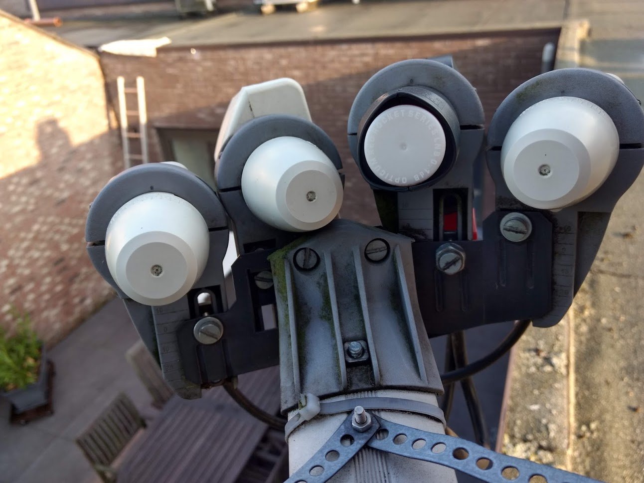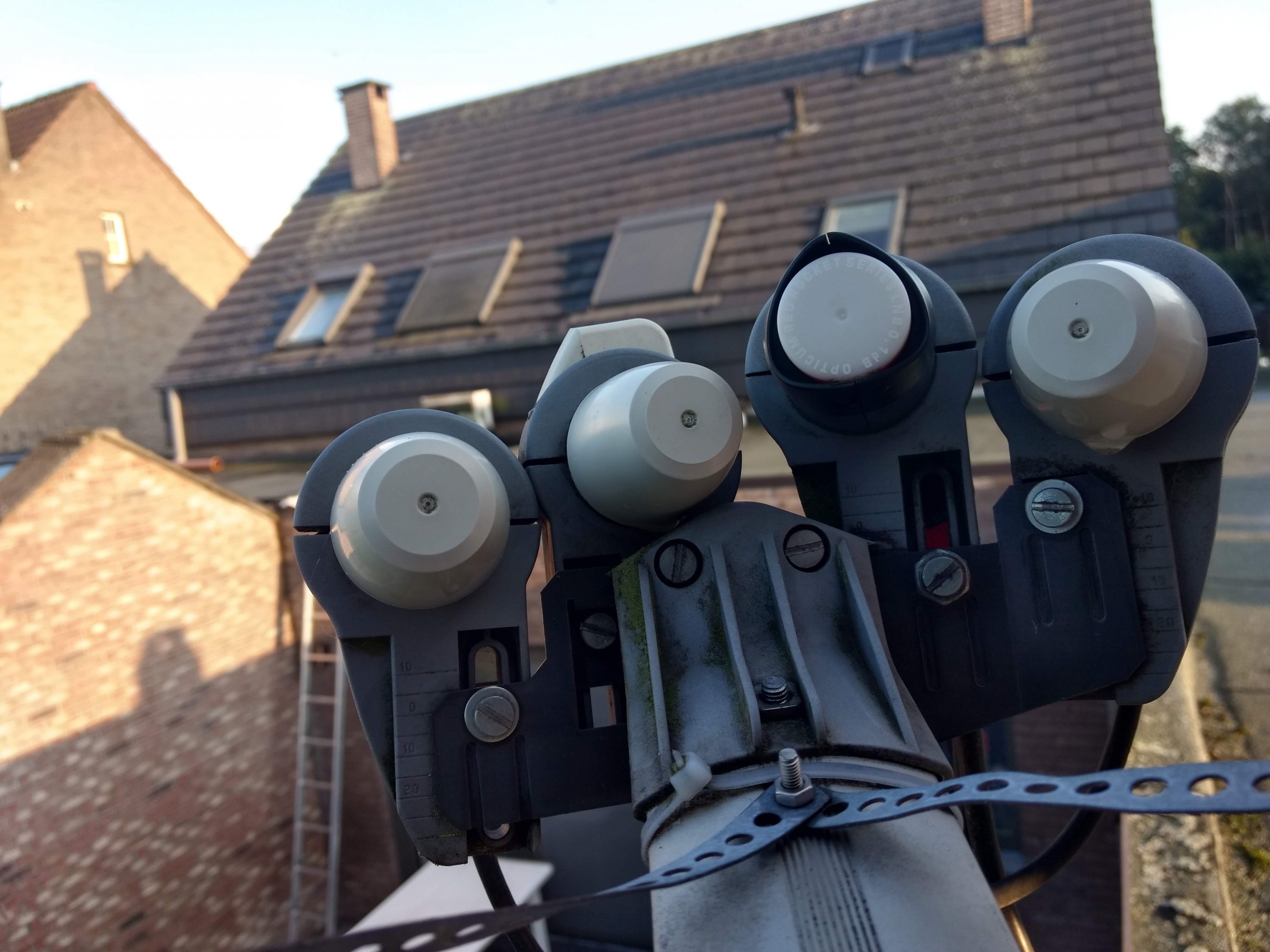 Sprietje Geplaatst: 14 augustus 2019 Geplaatst: 14 augustus 2019 (aangepast) Beste ringlord Als eerste de controle of het dak van je huis mogelijk een belemmering vormt voor een goede ontvangst. Dat was een terechte vraag van je. Volgens Google-Earth is de nok van je huis 8 meter hoog en het dak van je garage 3 meter. Het hoogteverschil is dus 5 meter waarbij de onderzijde van de schotel ook nog bijna 1 meter boven het garagedak staat. Op Dishpointer is te zien dat de nok van je huis 9,2 meter hoger mag zijn dan de onderzijde van je schotel. Het hoogteverschil is maar 5 meter dus het signaal van de Astra 23,5 die het zwakste bij je is wordt zeker niet gestoord door de nok. Je hebt nog 4-5 meter ruimte over. Ook de 2 gemetselde schoorstenen aan de achterzijde van het dak vormen geen belemmering omdat ze niet in de richting van één van de vier satellieten staan en omdat ze niet hoog genoeg zijn. In Edegem moeten de lnb's in een schuine lijn staan die 12,5 graad schuin staat, zie de bijlage met de rode schuine lijn met 4 lnb's. Op die foto staat de rode lijn echter 11 graden schuin. Hij moet dus iets schuiner komen, zie bijgevoegde hoek. Omdat we de Clarkebelt zien als een bol gebogen lijn, resulteert dat door de spiegeling van de schotel in een hol gebogen lijn voor de opstelling van de lnb's, de groene lijn. Een paar zaken vallen me op. 1 - de A19,2-lnb moet altijd op het nul-referentiepunt afgesteld worden. Volgens mij staat die lager. Hij moet dus iets omhoog. (zie nul-positie lnb-houder bijlage) 2 - de Hotbird-lnb staat te laag, die moet omhoog 3 - de A23,5-lnb moet een fractie omlaag 4 - de Astra 28,2-lnb moet heel veel omhoog Verder valt me op dat de A19,2-lnb scheef staat. Die kijkt niet naar het midden van de schotel maar veel meer naar rechts op de foto. Dit is niet normaal. Probeer die eens recht te zetten. Door deze situatie staan de Astra 19,2 en 23,5-lnb dichter bij elkaar dan de bedoeling is. Als je de schotel op de Astra 19,2 uit richt zoals het hoort, ontvangt de A23,5-lnb op dit moment dus minder signaal. Verder denk ik dat de Opticum-lnb te ver naar voren staat. Kijk eens of je beter signaal krijgt als je die wat naar achteren zet. Na de veranderingen van de lnb-posities, zul je de schotel opnieuw heel precies uit moeten richten met zowel de elevatie als de Azimuth (draairichting). Verder denk ik dat de skew van de 23,5 en 28,2-lnb niet helemaal goed staat. Ze moeten beide wat met de wijzers van de klok worden meegedraaid als je er achter tegenaan kijkt. Als je nog niet helemaal tevreden bent met de ontvangstkwaliteit van de Astra 23,5, richt de schotel dan eens uit op de Astra 23,5. 14 augustus 2019 aangepast door Sprietje
