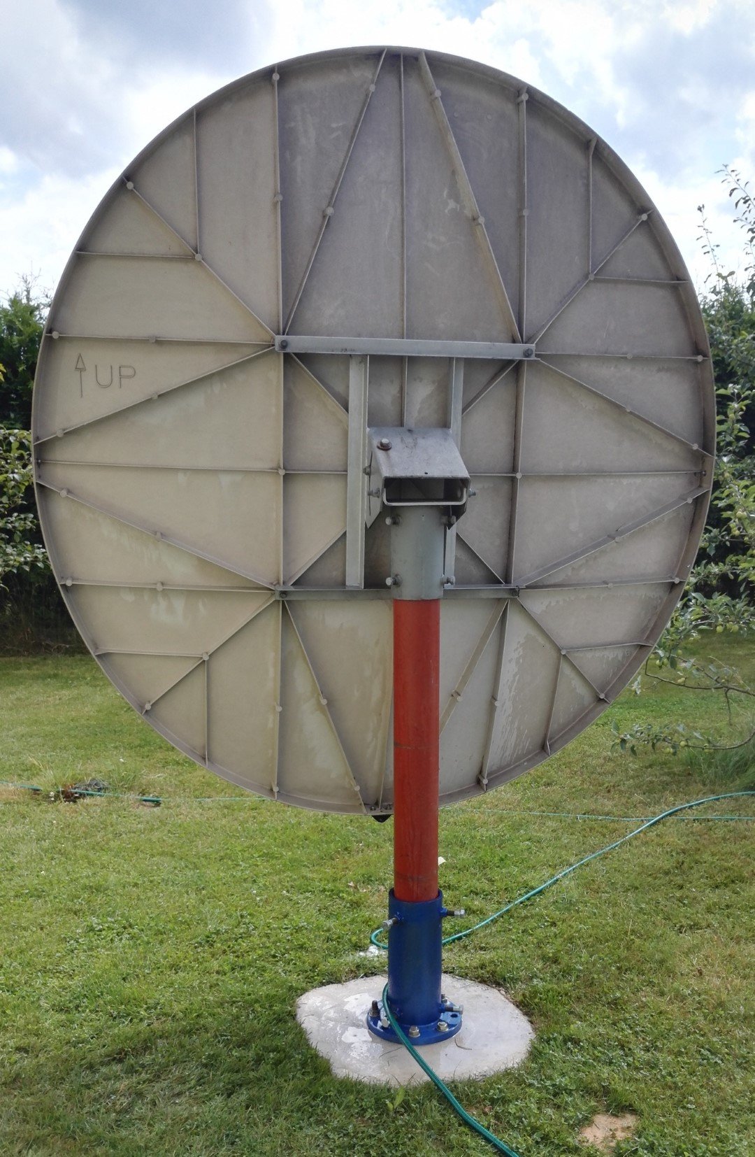 De afstand tussen het beton en de metalen voetsteun voor de mast zou dan wel meer bedragen dan de dubbele diameter van de draadstangen zoals Tonskidutch aangaf (wel minder dan op de foto), maar aangezien de schotel niet te hoog staat zou ik het proefondervindelijk willen vaststellen wat dit in de praktijk laat zien.