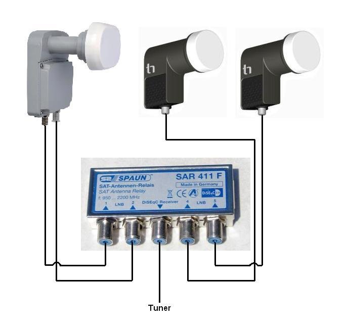 Sprietje Geplaatst: 9 maart 2020 Geplaatst: 9 maart 2020 (aangepast) Ja, je kunt er een Triax rail voor nemen waarvan je later de overtollige lengtes aan beide zijden af kunt zagen zodat het wat beter oogt. In Sant Carles de la Rapita moet de rail 20 graden schuin staan. Dat bereik je precies als je de rail omdraait zodat het gat in het midden in de onderste groef zit. Om de afstand van 56mm tussen de Hotbird 13 en Astra 19,2 goed in te kunnen stellen, zou ik de Inverto Black Premium single nemen IDLB-SINL41-PREMU-OPP, zie: https://www.inverto.tv/lnb/242/single-selected-40-mm-lnb Die heeft een kop van 49mm. De skew van de Hotbird-lnb moet op -10,5° staan t.o.v. verticaal, niet t.o.v. de rail. - de duo-lnb zet je met de kop van de Astra 23,5 in de klem terwijl de kop van de Astra 19,2 ongeveer midden boven de arm staat. - de duo-lnb plaats je evenwijdig aan de rail en zo dicht mogelijk naar de schotel - de Hotbird-lnb plaats je in de tweede klem die in spiegelbeeld gemonteerd is zodat de kop van de Hotbird en de Astra 19,2 ongeveer 1mm van elkaar staan. Dan zit je op die berekende afstand van 56mm. - de rail zet je nu maximaal schuin (=20°) met de Hotbird-lnb het laagst. De duo-lnb heeft waarschijnlijk 2 of 4 aansluitingen. Je kunt een gewoon 4-1 diseqc-switch gebruiken. Twee aansluitingen van de duo-lnb sluit je aan op poort 1 en 2. De Hotbird-lnb sluit je aan op poort 3, zie bijlage. De diseqc-volgorde in je ontvanger moet je dan instellen op: 1 = Astra 19,2 2 = Astra 23,5 3 = Hotbird 13. 9 maart 2020 aangepast door Sprietje