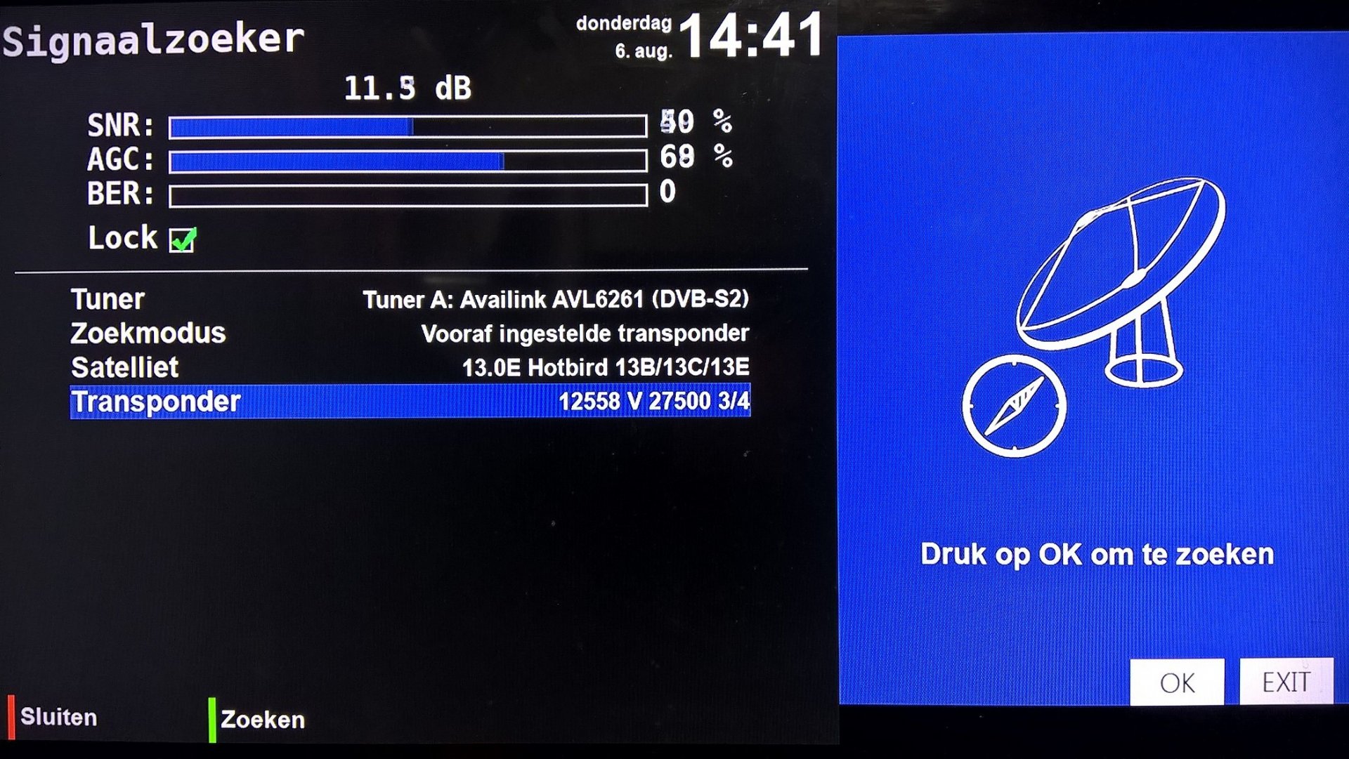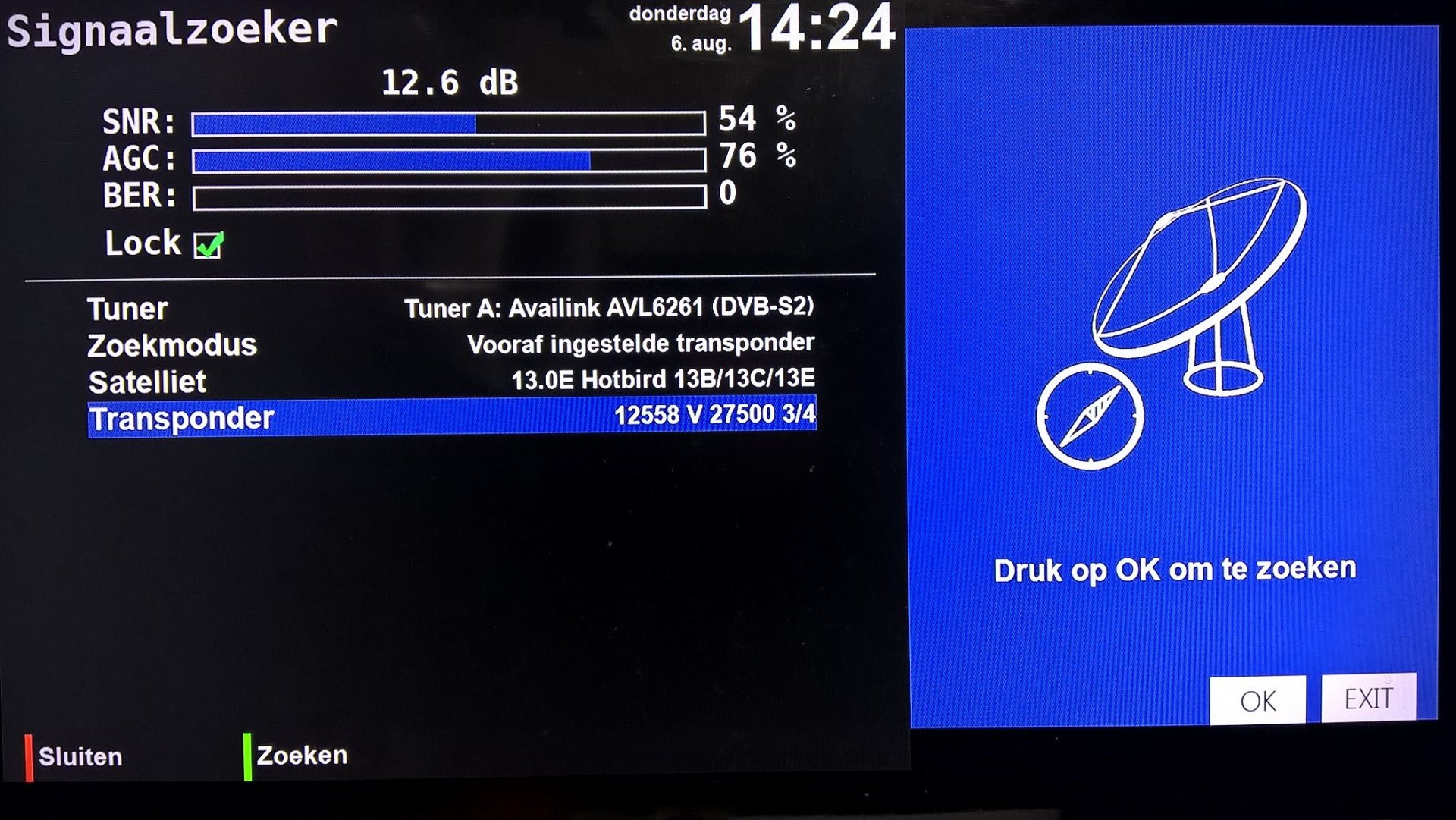 Satterdam Geplaatst: 19 april 2020 Auteur Geplaatst: 19 april 2020 1 uur geleden, Codx zei: Ik vermoed dat je schotel niet optimaal uitgericht staat. Hoe komt 12.539 H 30000 5/6 8PSK bij je binnen? Beide TP's hebben namelijk een C/N van tenminste 9.4 dB nodig wat op zich helemaal niet bijzonder hoog is maar wel vereist dat de schotel goed staat uitgericht. Deze transponder komt prima binnen