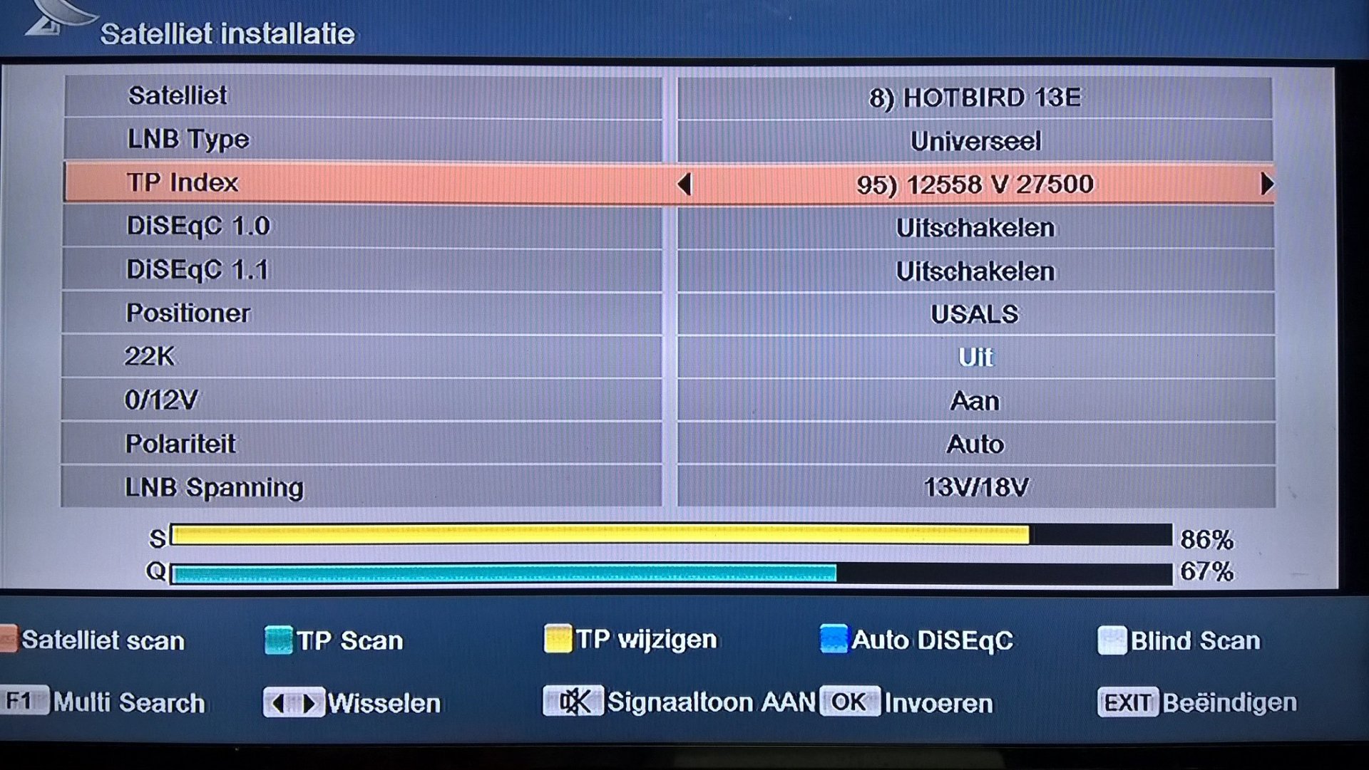 Satterdam Geplaatst: 19 april 2020 Geplaatst: 19 april 2020 Van de week is er een pakket saudische zenders van start gegaan op de Hotbird op transponder met de volgende parameters: Frequentie: 12558 Polaristatie: verticaal Symbolrate: 27500 FEC: 3/4 helaas komt deze transponder zwak binnen op mijn Triax 88 cm schotel. Het signaal schommelt heel erg. Tussen 30 en 45 % met soms een uitschieter naar 50 tot 60 % . het beeld is hier door heel erg blokkerig/verstoord. Mijn opstelling is een tegelvoet op het balkon met vrije uitzicht. Dus geen bomen of gebouwen in de weg. het is een multifeed opstelling met 3 lnb's . ben nu overgeschakeld op een single lnb opstelling maar ook dat maakt geen verschil . Ik weet niet wat ik verder nog kan doen. Is het signaal van de transponder gewoon zwak? een 88cm schotel moet ruim voldoende zijn voor Hotbird ontvangst.