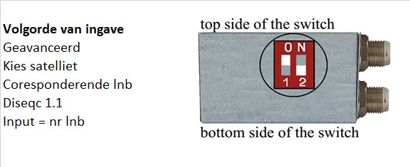 mebo870 Geplaatst: 9 juni 2020 Geplaatst: 9 juni 2020 (aangepast) Hum hum, nog een switch die niet werkt, toch wel hoor Trek het plastic deksel van de switch en daar bevinden zich 2 kleine schakelaars de eerst zet je naar boven (ON) de 2de naar beneden (OFF) dan staat de EMP in Diseqc mode 1.1. dan schakel je probleemloos tot 8 lnb's 9 juni 2020 aangepast door mebo870 The key to happiness. Stay away from idiots