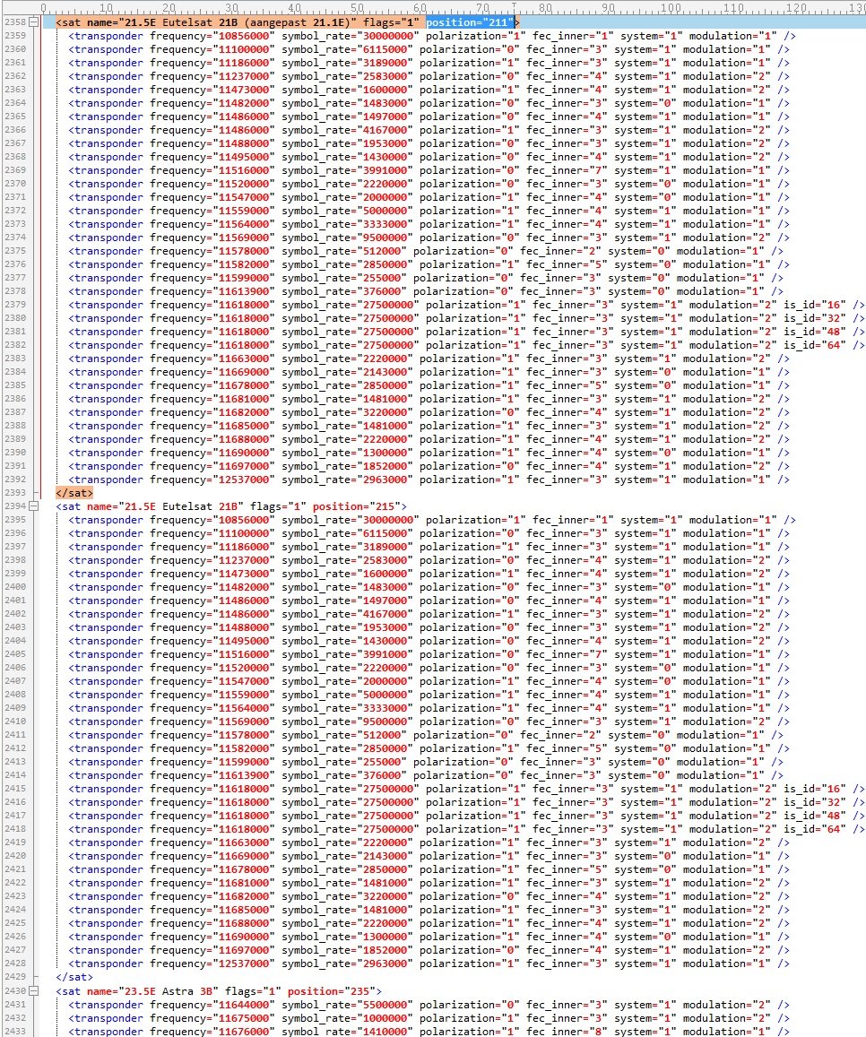 -verwijderd- Geplaatst: 2 juni 2020 Geplaatst: 2 juni 2020 (aangepast) Een mogelijkheid is om in het bestand "satellites.xml" de satelliet positie te wijzigen of een aparte positie toe te voegen.(het bewerken kan met DCC_E2 of een andere tool of texteditor,...) satellites.xml staat in de map /etc/tuxbox/satellites.xml Bij PLi zit Eutelsat 21,6°E op position="215" wat gelijk is aan 21.5°E <sat name="21.5E Eutelsat 21B" flags="1" position="215"> </sat> Jij wilt 0,4° meer naar het oosten draaien (richting 0-punt rotor). Dan wordt position="215" voor jou, position="211" waardoor de schotel naar 21.1°E draait i.p.v 21.5°E (dus 0.4° meer naar het oosten)meer oost laten draaien = position verlagen meer west laten draaien = position verhogen Let wel dat jouw satellites.xml bij een PLi update zal worden overgeschreven. Dit kan je voorkomen door jouw satellites.xml te plaatsen in de map /etc/enigma2/satellites.xml Als jouw tuner kan blindscannen hoeven er geen frequenties bij te staan. Dan zijn volgende twee regels voldoende: (sat name="mag je zelf kiezen") <sat name="21.5E Eutelsat 21B (aangepast 21.1E)" flags="1" position="211"> </sat> Anders zie afbeelding: voorbeeld van copy & paste van frequenties naar position="211" (na de aanpassingen E2 herstarten) 2 juni 2020 aangepast door satmaat screenshot toegevoegd