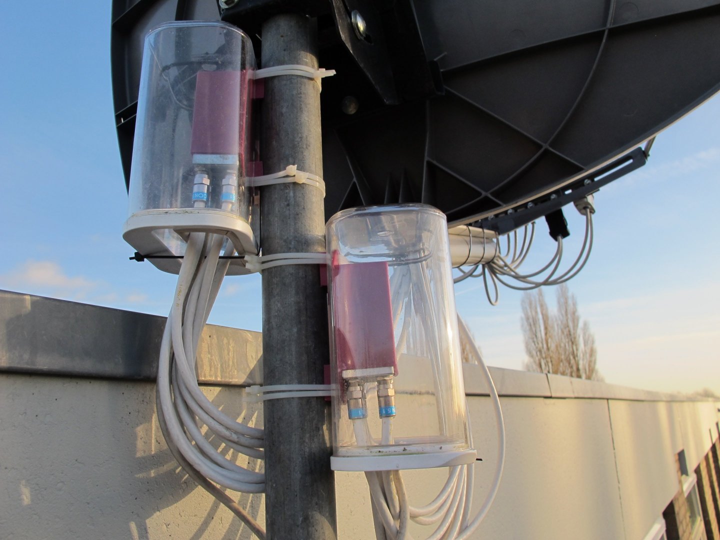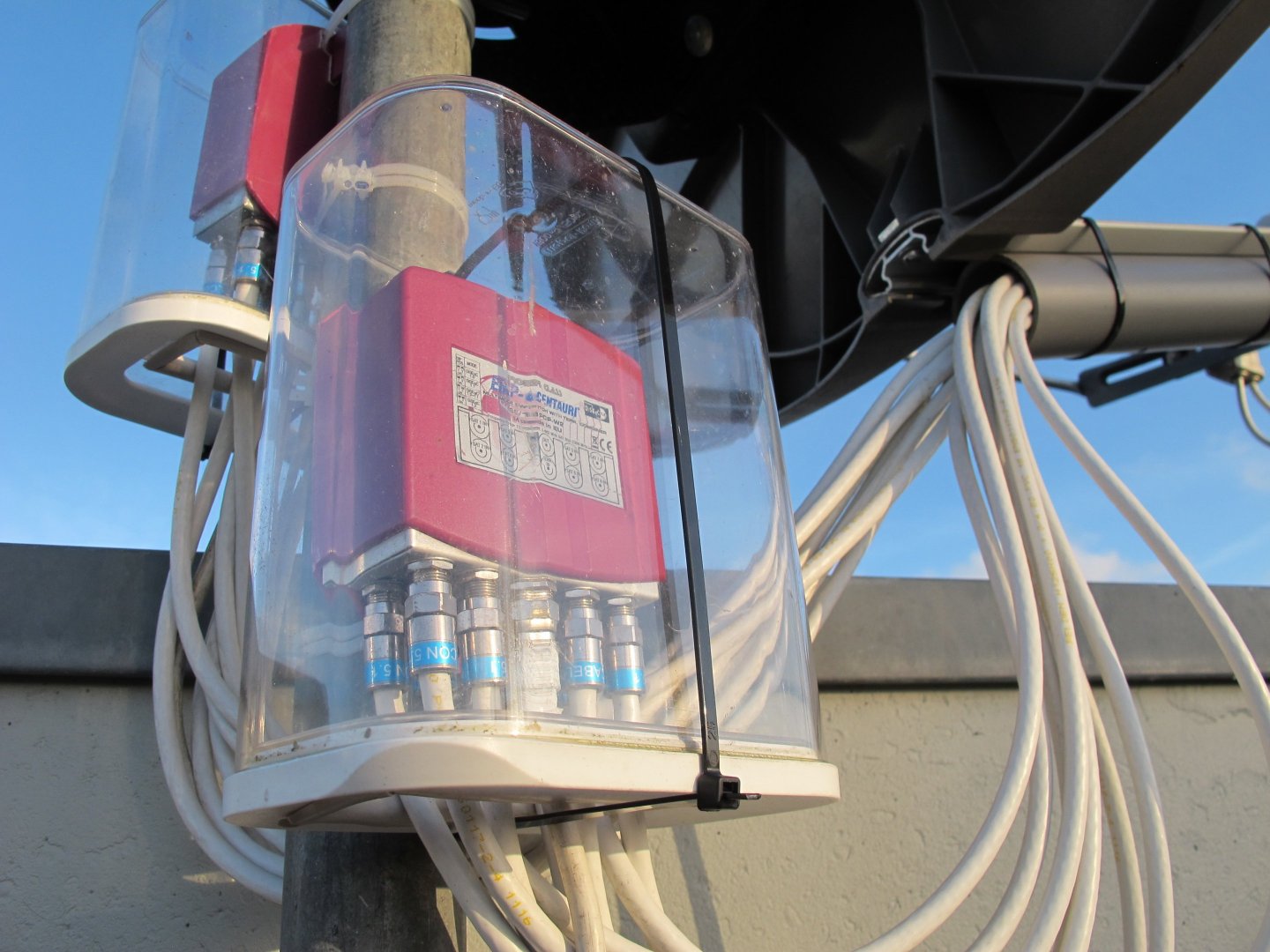 cheapwatcher Geplaatst: 22 juni 2020 Auteur Geplaatst: 22 juni 2020 14 uren geleden, dirk044 zei: Ik heb bij mijn Big Bi Sat destijds een stukje grijs PVC buis gebruikt net zo lang als de LNB arm en daar alle 16 kabels door heen gevoerd. Om die scherp geknikte kabels te voorkomen is het aan te bevelen om switches te kiezen met de aansluitingen aan één kant, de onderkant dus. Dan kun je ook makkelijker een geschikte plastic box vinden, in mijn geval Modula voorraaddozen bij Blokker. Ik vond de regenkapjes die bij een switch worden geleverd niet beschermend genoeg. Bij deze oplossing kan het hozen van de regen, maar de switch zal er géén last van hebben. Die doosjes had ik eerst ook, maar bij de nieuwe switches gaat dat dus niet passen. Ik had via ***** een big bisat overgenomen voor een leuk prijsje. Daar zaten de switches bij. Ook een heel stel quad lnb's, maar helaas werkte er maar 1 nog goed. Visiosat Big Bisat (0.8W, 5W, 9E, 13E,19.2E,23.5E,28.2E) 3 x Inverto quad, 2 x Alps quad, 1 x Venton rocket 1 x technisat quad 2 x Disecq 1/8 1 x Diseqc 1/10 VU+ Ultimo 4k DVB-S FBC/DVB-C FBC,WD AV GP WD20EURS, 2TB @ Panasonic tx-50exw784 + Logitech Harmony 665 Qviart Lunix 4K @ Panasonic TX-L42E5 + Logitech Harmony 700 Ziggo start CI+