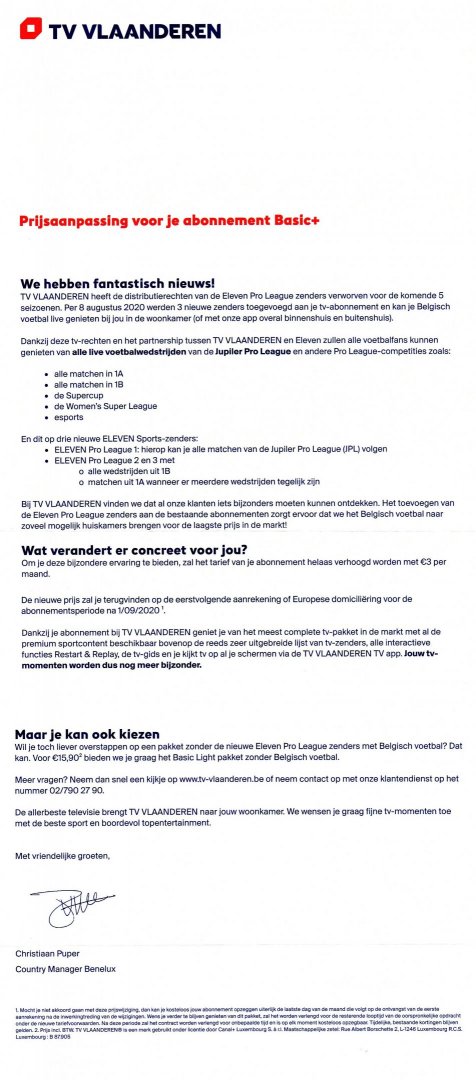 Brambo's Geplaatst: 1 september 2020 Geplaatst: 1 september 2020 Vandaag heb ik ook zo'n brief ontvangen als Basic+ klant. Er wordt eveneens een tariefverhoging vermeld van 3 EUR per maand. Kortom: als je geen prijsverhoging wilt omwille van het voetbal, kan je enkel naar Basic Light ofwel opzeggen. P.S. Kan een moderator eventueel de titel aanpassen naar "Prijsverhoging Basic en Basic+" aub? - VU+ Duo met OpenPli, TVV Basic+ abo --> Basic Light - Triax 78 met multiblock 13-19,1-23-28,2 - Panasonic TX-P46G10 full HD.