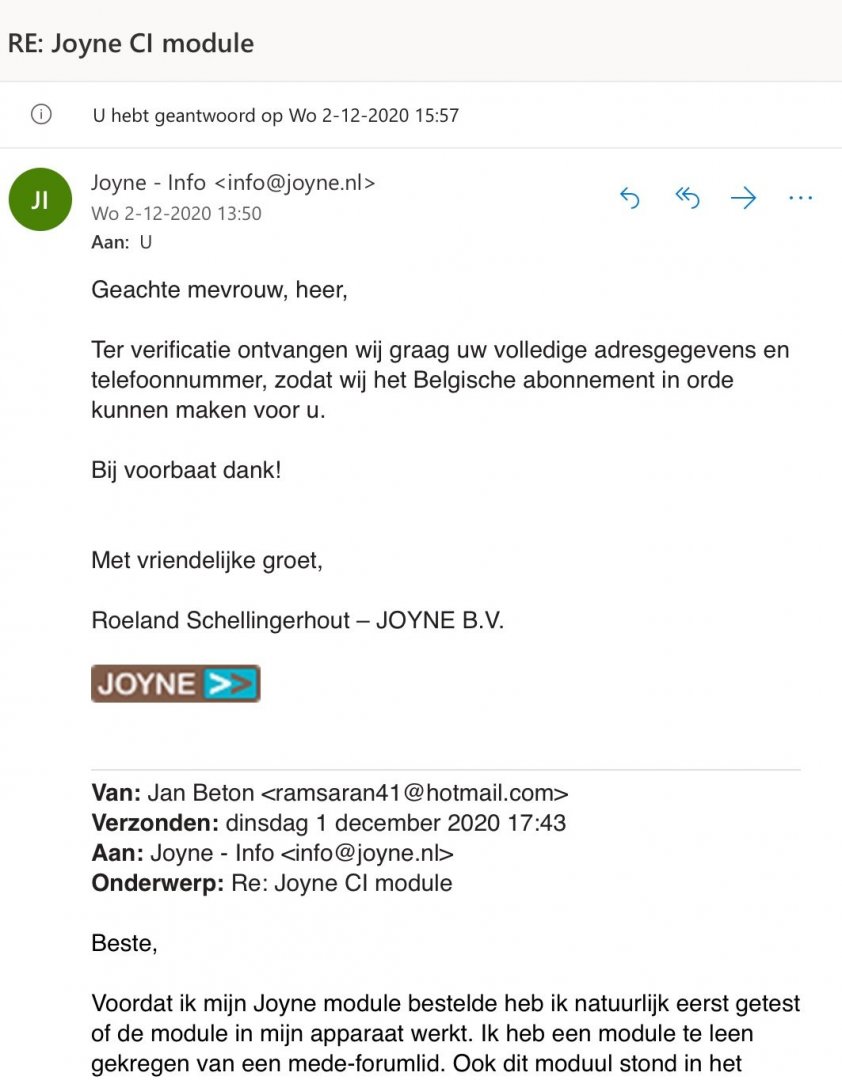Berteman Geplaatst: 10 januari 2021 Geplaatst: 10 januari 2021 (aangepast) Op 23-12-2020 om 19:23, Satwatcher zei: Dat hoeft je zeker niet te doen. Ik geloof je ook dat je het zo hebt gedaan. Het kan mogelijk echter wel de nodige consequenties voor Joyne krijgen. Als inwoner van Nederland ben ik anders wel abonnee van TV Vlaanderen, en dat met een Nederlands adres en IBAN nummer. Waarom zou dat dan geen consequenties hebben voor TV Vlaanderen maar mogelijk wel voor Joyne? Ik begrijp dat niet zo. Hoe dan ook: als het mijn schotel lukt de Eutelsat op 9 graden O te ontvangen, dan stap ik zeker over naar Joyne, met zowel het Nederlandse als Vlaamse aanbod: is een stuk voordeliger dan een maandelijkse automatische incasso van CD en aanrekening van TVV. 😉 11 januari 2021 aangepast door Berteman tiepvout verbeterd VU+Solo4K, VUSoloSE, Synology NAS, MacBook Pro, HP Envy