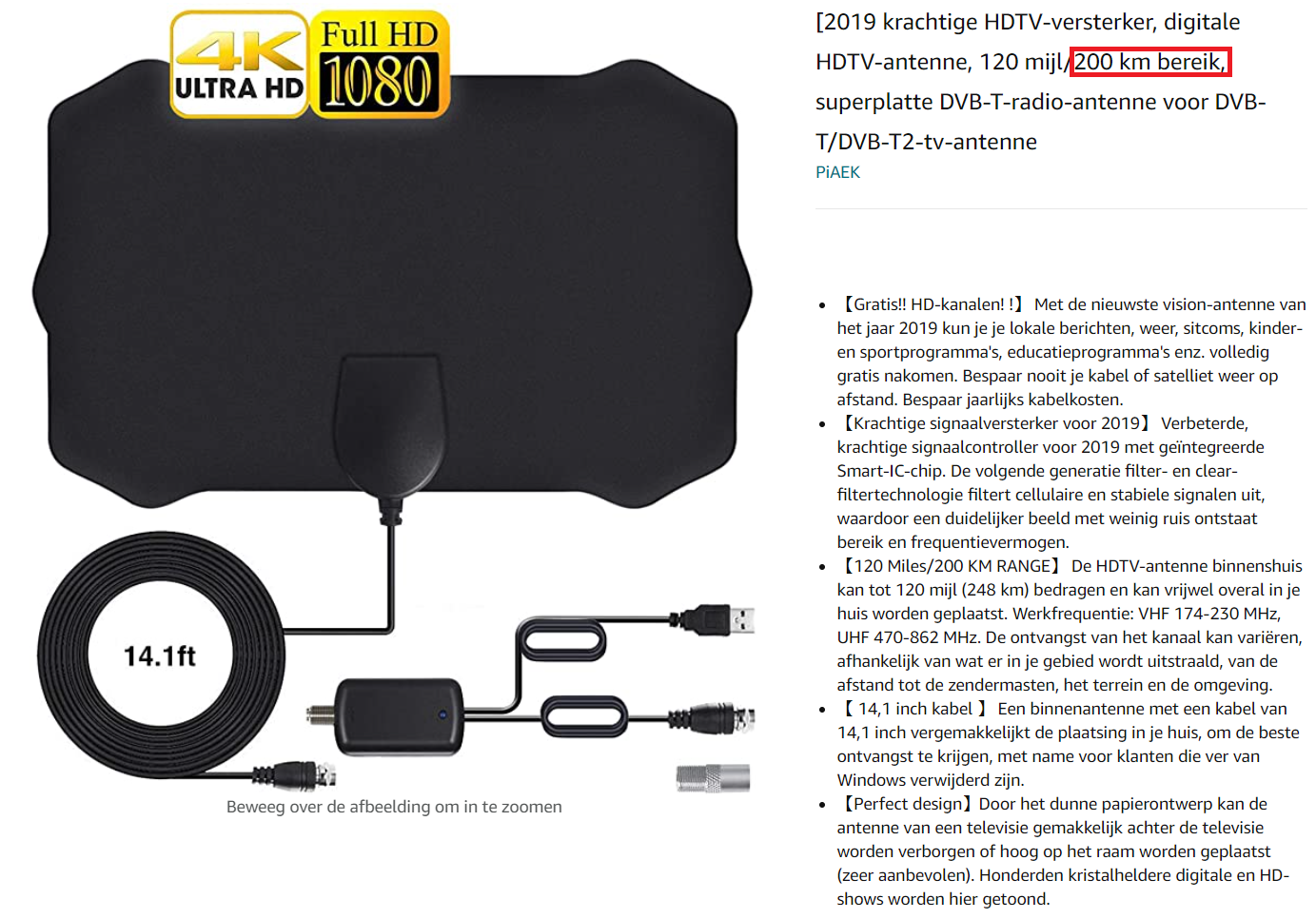 Sprietje Geplaatst: 28 november 2020 Geplaatst: 28 november 2020 (aangepast) Sinds de overgang van analoge terrestriale (aardse) tv ontvangst naar digitale terrestriale tv ontvangst, zijn binnenantennes erg populair. Eindelijk verlost van sneeuw- en geestbeelden! Veel fabrikanten prijzen de binnenantennes aan omdat je er heel veel gratis te ontvangen (ongecodeerde) zenders mee zou kunnen ontvangen dit in tegenstelling met andere vormen van ontvangst. En hoe verder het bereik van zo'n antenne dan is, hoe meer vrij te ontvangen zenders je kunt ontvangen. Fabrikanten en verkopers doen hun best om hun antennes goed aan te prijzen en dat doen ze door aan te geven tot op welke afstand zenders te ontvangen zijn. Fabrikanten gaan al tot waanzinnige afstanden maar verkopers doen daar makkelijk nog een factor 4 bovenop in hun reclame. Laten we niet te gek beginnen bij een antenne voor een bereik van 50km en kijken welke antenne we nodig hebben voor een ontvangst van veel verder gelegen zenders! Het is ook al meerdere keren op dit forum ter sprake gekomen hoe je bijv. zenders op 40 of 60km afstand kunt ontvangen en welke antenne je daar voor nodig hebt. En deze laatste met een bereik van 20.000 mijl is maar liefst 32.000km, bijna de aarde rond. 28 november 2020 aangepast door Sprietje beelden verder uit elkaar gezet 1