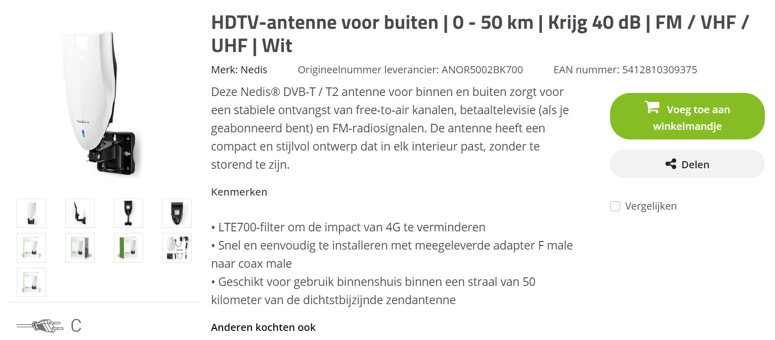 Moderator ceesv Geplaatst: 30 november 2020 Moderator Geplaatst: 30 november 2020 Bijvoorbeeld een halve rasterantenne, hierboven is de dubbele afgebeeld. Het is een Nedis antenne, maar ook andere merken hebben dit model in hun assortiment. Wittenberg maakt ook compacte DVB-T antennen. Bijvoorbeeld de Wittenberg SN 20 Gaat niet bestaat niet! 65" 4-K OLED, Vu+ Duo 4K SE BT, Vu+ Solo 4K, Rebox-8500, Rebox-8000, Wavefrontier T-90, Satlook Digital NIT, Megasat HD5 Combo Gebruik je een advertentie blocker? Maak dan een uitzondering voor onze website. Zonder advertentie (inkomsten) kan deze site niet voortbestaan.