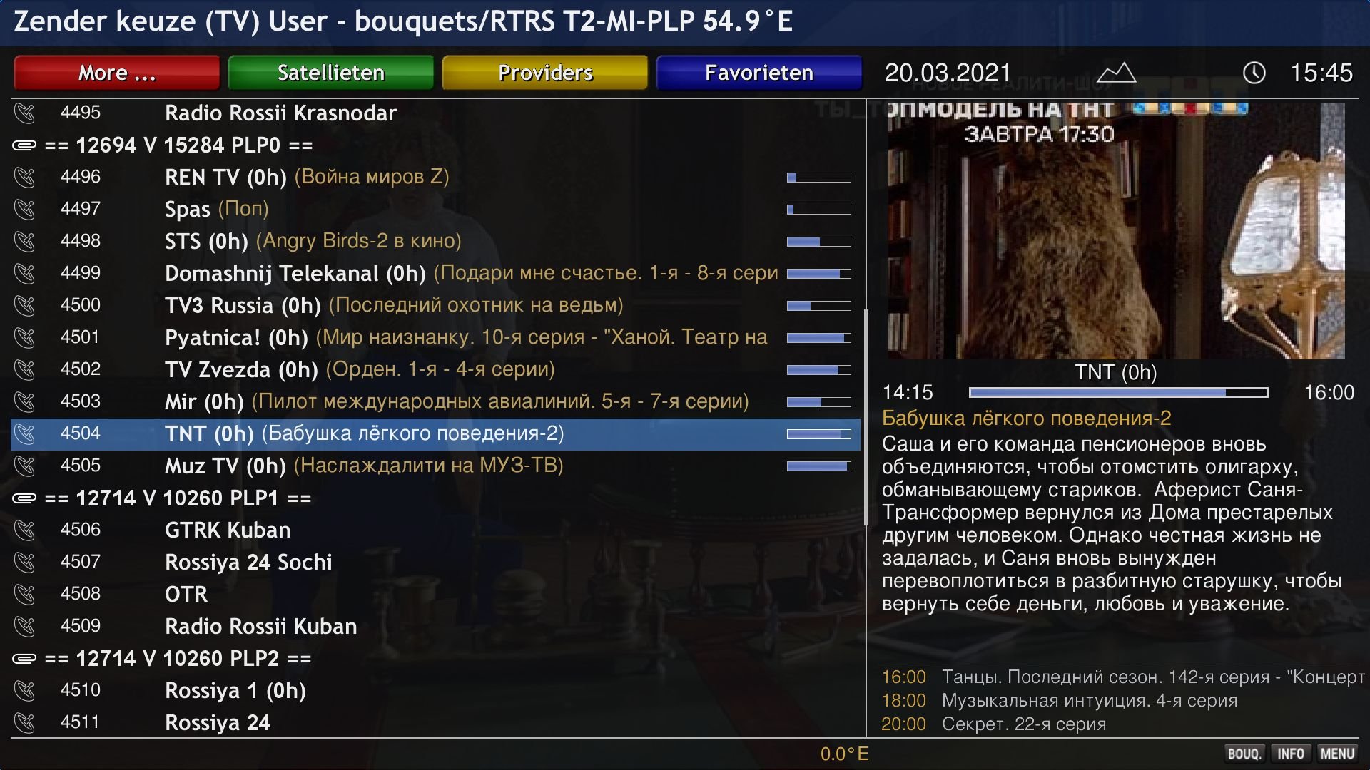 -verwijderd- Geplaatst: 21 maart 2021 Geplaatst: 21 maart 2021 Om het makkelijk te houden heb ik alles in één bouquet geplaatst (ook de 4 data T2-MI transponder gegevens 54.9°E). Dit bouquet kan met dreamboxEDIT geïmporteerd worden naar de eigen zenderlijst. Vervolgens de zenderlijst bewaren zodat transponder data aan lamedb toegevoegd wordt. Daarna zenderlijst terug naar de ontvanger schrijven. astra.conf userbouquet.rtrs_t2_mi_plp_54_9_e.tv astra-conf.zip userbouquet.rtrs_t2_mi_plp_54_9_e.zip (.zip bestanden uitpakken) zie screenshots, voorbeeld astra-sm installeren met openimage Spoiler opkg update && opkg install astra-sm astra.conf vervangen in /etc/astra met dreamboxEDIT userbouquet.rtrs_t2_mi_plp_54_9_e.tv importeren naar eigen zenderlijst zenderlijst bewaren en terug naar de box schrijven enigma2 box herstarten en zappen naar 54.9E 1