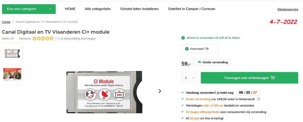 Sprietje Geplaatst: 23 augustus 2023 Geplaatst: 23 augustus 2023 8 uren geleden, MaartenM zei: Wat betreft het overzetten van eerst enkele zenders: volgens mij hebben ze vorig jaar al zenders omgeschakeld. Ik kan me herinneren dat abonnees die klaagden, te horen kregen dat ze maar een CI-module moesten kopen. Toen nog à € 100,= De witte CI+ modules zijn nooit zo duur geweest. Hier nog een schermafbeelding van 4-7-2022 waarbij je hem voor €59,- kon kopen met gratis verzending.