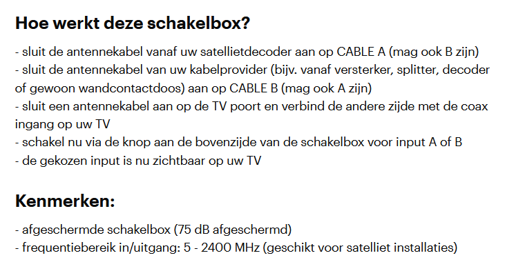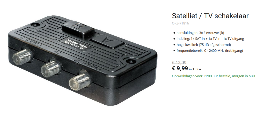 Sprietje Geplaatst: 29 april 2021 Geplaatst: 29 april 2021 (aangepast) 23 minuten geleden, acguest zei: Ik heb persoonlijk niet zo goede ervaring met die type splitter. Ik probeerde toen TVV ontvanger en SKY ontvanger en dat gaf meestal als resultaat veel bitloss op de ontvangers. Ik heb ook een priority switch geprobeerd maar dat resultaat was eigenlijk hetzelfde. Het enige positieve aan deze switches was het gevecht tussen beide ontvangers (enkel hielp de ontvanger zonder stroom te zetten). Als het mogelijk is kun je beter opteren voor een Monoblock met ingebouwde Switch - persoonlijk gebruik ik de Opticum LMTP-4/3H voor Astra 19 en 23 op een 90 cm schotel. Tja een splitter geeft nu eenmaal minimaal 5,5db verlies. Bovendien blijft de voedingsspanning bij de meeste satellietontvanger op de coax staan als je hem uit zet met de afstandsbediening. Die gaat er pas van af als je de ontvanger met de schakelaar aan de achterzijde uit zet. Ik zou zelf ook geen splitter nemen maar voor in de camper gewoon een coax-schakelaar. Die koop je in Nederland voor €9,99 en is geschikt voor satellietsignalen. Die geeft geen verlies en je hoeft ook niet bang te zijn dat je de ene ontvanger niet uit zet om op de andere te gaan kijken. Een monoblock kan natuurlijk niet op zijn automatische schotel. 29 april 2021 aangepast door Sprietje