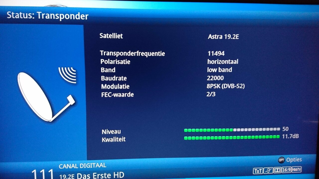 Michel-nl Geplaatst: 10 mei 2021 Auteur Geplaatst: 10 mei 2021 22 minuten geleden, Sprietje zei: Beste Michel-nl Welkom op dit forum. Dat je nogal wat beelduitval hebt gehad tijdens de regen kan ook liggen aan het feit dat de schotel en de lnb niet goed genoeg was uitgericht. Het hoeft dus zeker niet aan de Triax 65 te liggen maar bij flinke buien kan het beeld met een Triax 65 ook bij een goed uitgerichte schotel uitvallen. Met een maatje groter wordt die kans inderdaad kleiner. Helaas past een lnb voor een schotel van 60cm niet echt goed op een schotel van 70cm breed. Je moet in ieder geval de kop van de Astra 23,5 in de klem zetten en de schotel optimaal uitrichten op de Astra 23,5. Verder is het belangrijk dat je de duo-lnb op de juiste schuinte zet. Dat is in Boornbergum bij Drachten 12°. Stel die schuinte in met bijgevoegde hoek. Overigens zijn er maar weinig betaalde zenders van Canal Digitaal die op de Astra 19,2 zitten, zie deze lijst: https://m7cdn.io/canaldigitaal/downloads/zenderlijst.pdf Vind je het toch fijn om de Astra 19,2 er bij te hebben, dan bestaan er wel passende duo-lnb's. Hoeveel aansluitingen wil je hebben? Is 1 aansluiting voldoende voor op de Camping? Als je de Astra 19,2 niet wilt ontvangen, neem dan een enkele lnb, bijv. de Inverto Black Ultra. Die heb je met 1, 2 of 4 aansluitingen. Uiteraard heb ik mij best gedaan met het afstellen van de satelliet schotel. We hadden maar een kwaliteit van rond de 70 en een 5db Uiteraard ga ik met de 80cm schotel de 19.2 verliezen. Zoals gezegd vinden wij dat geen punt echter las ik ergens dat soms de 19.2 nodig kon zijn om bepaalde kanalen in te laden. Voor ons is enkel de zenders van astra 3 noodzakelijk. Alle andere zenders hebben we niks mee, het gaat puur om de NL zenders en een beetje extra. Er hoeft ook maar 1 tv op aangesloten worden dus een enkele feed is belangrijk. Zoals ik nu begrijp kan ik het monoblock nu als enkele lnb gebruiken, maar een betere zou verstandiger zijn. Als ik dat zeker kan doen dan is dat uiteraard mijn keuze op korte termijn.