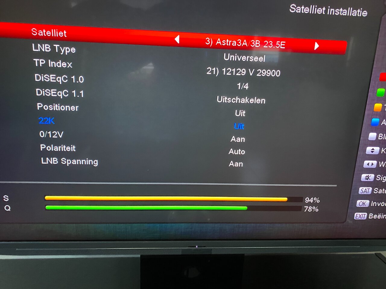 ARRIS VIP 5202 voor KPN, voor satelliet: Ik werk met NanoXX 9800HD met een Lenson Heath 80cm Offset schotel, icm Scorpion Universal Quad Lnbf: Input=10.7-12.75GHz, Output=950-2150MHz, L.o.=9.75/10.6GHz, Conversion Gain: 60dB, Noise Figure: 0.1dB, Alles draaiende dmv USALS met een Stab Italia HH100 rotor.