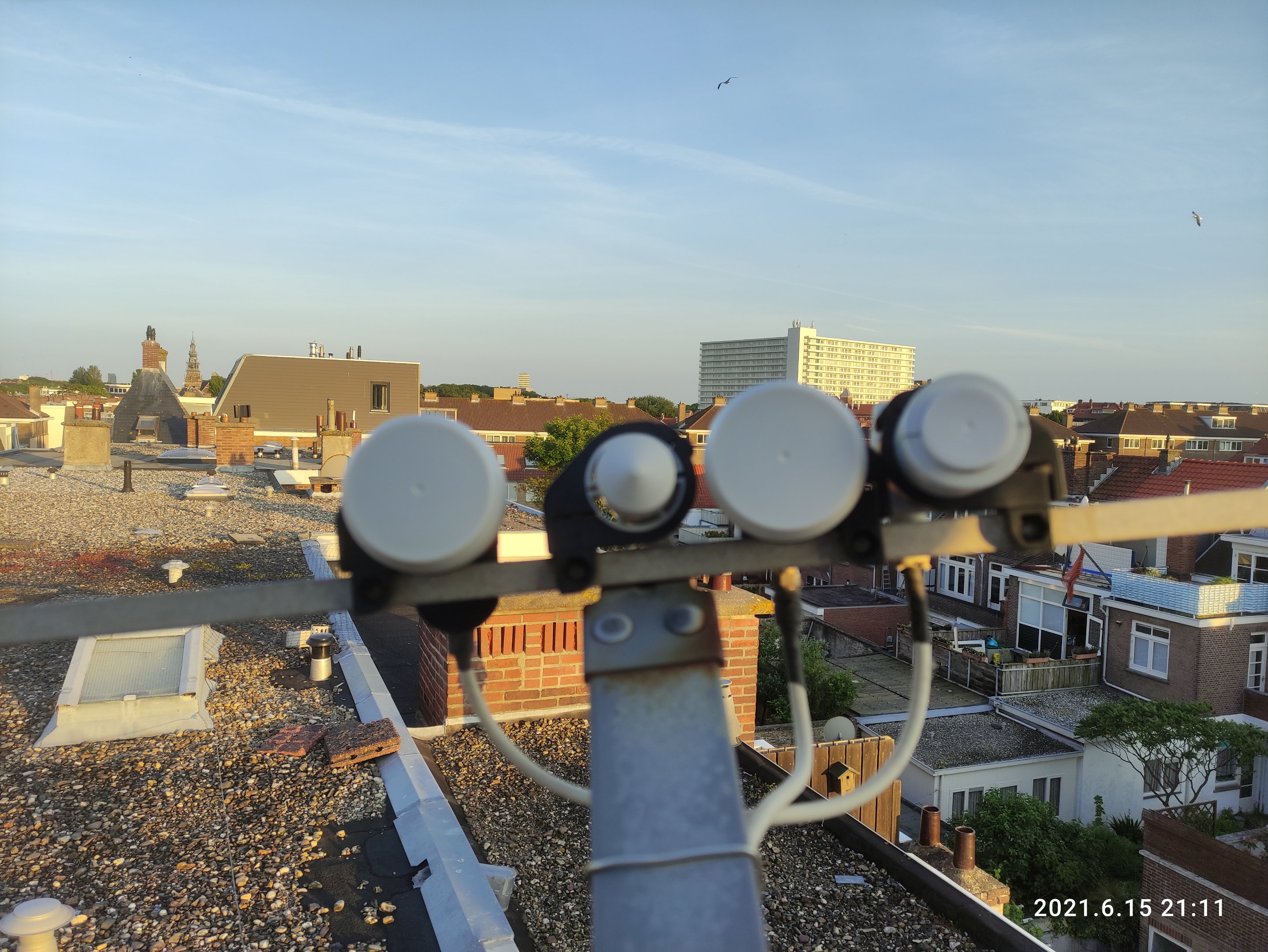 humptydumpty Geplaatst: 16 juni 2021 Auteur Geplaatst: 16 juni 2021 Eindelijk geïnstalleerd. Blijkt dat ik de laagste schotel van uit 30w gezien niet of weinig naar oost kan draaien. (Raakt de schoorsteen aan de linkerkant) De schotel die boven de schoorsteen uit kijkt daar staat de paal scheef van. Dat is bij te stellen maar tot nu toe alleen beeld op 13e en nog slecht ook. RAI 1: 60/40 met een inverto ultra black op de sat finder (staat in het midden van de schotel). Heb al staan duwen en trekken maar beter wordt het niet. Vanavond of morgen nog maar eens kijken. Is het wat koeler. DM500HD, DM500S, Humax 5400,aston 1.05, Maximum Multi Focus E85, 28.2/5--23.5--19.2--13