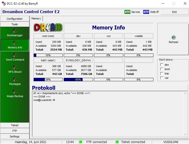 joker55 Geplaatst: 14 juni 2021 Auteur Geplaatst: 14 juni 2021 ik zie ook dat je eigenlijk DCC-E2 genoemd hebt....deze had ik nog niet, ffr gedownload. 20 minuten geleden, joker55 zei: via DCC_E2.exe kun je de HDD van de Vu+ benaderen en meerdere gegevens opvragen in telnet met de juiste syntax bijvoorbeeld >mount< om te zien hoe de HDD is aangekoppeld="gemount" Hier dus wat plaatjes, maar commando mount geeft hetzelfde antwoord als eerder gepost. HUMAX iCord is vervangen door de VU+ 4k SOLO,