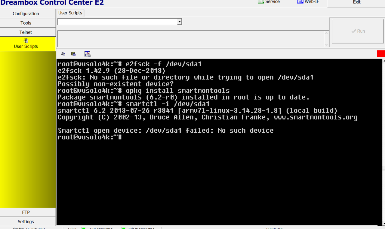 joker55 Geplaatst: 15 juni 2021 Auteur Geplaatst: 15 juni 2021 6 uren geleden, Tonskidutch zei: voorbeeldje hoe je in telnet de disc kunt checken daarna de smartmontools geprobeerd Zie plaatje waar het programma mee terug komt? Lijkt erop of de HD niet te benaderen is. n HUMAX iCord is vervangen door de VU+ 4k SOLO,