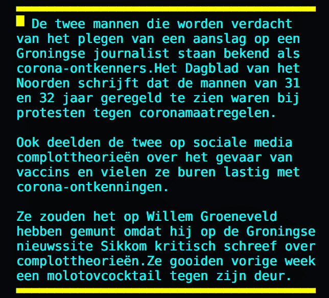 minplus Geplaatst: 28 augustus 2021 Geplaatst: 28 augustus 2021 9 uren geleden, boudeman zei: Hoe gestoord kun je zijn; teletext vandaag. Kon je op je klompen aanvoelen. Een bepaald clubje idiote complot-aanhangers bedreigt wetenschappers, mensen op de GGD, journalisten, etc. 3x VU+ met Open Pli , 2 Gregorians, 1 Big bisat, 1 Oled en 2 LCD's