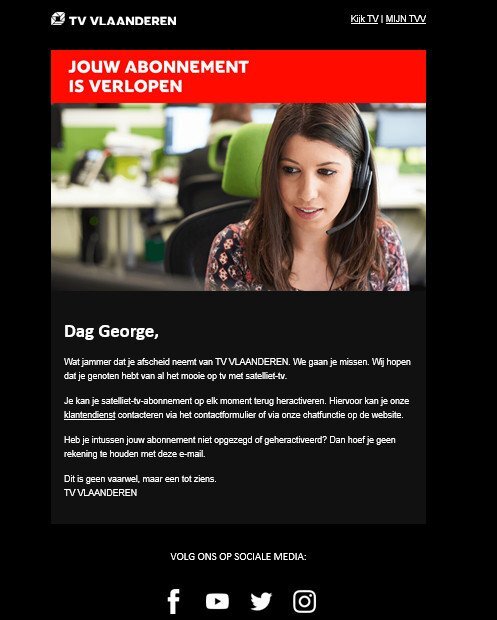 oneones Geplaatst: 26 oktober 2021 Geplaatst: 26 oktober 2021 Vandaag ook deze mail bekomen van TV-Vlaanderen. Hun database werkt wel fantastisch moet ik zeggen. We zitten met een actief jaarabonnement, hetgeen gedomicilieerd is. (geen Joyn gebruiker - mail komt uit het NIKS !!) Mijn ouders (tachtigers) waren natuurlijk in paniek dat ze hun programma's niet meer konden zien. Onbegrijpelijk ...