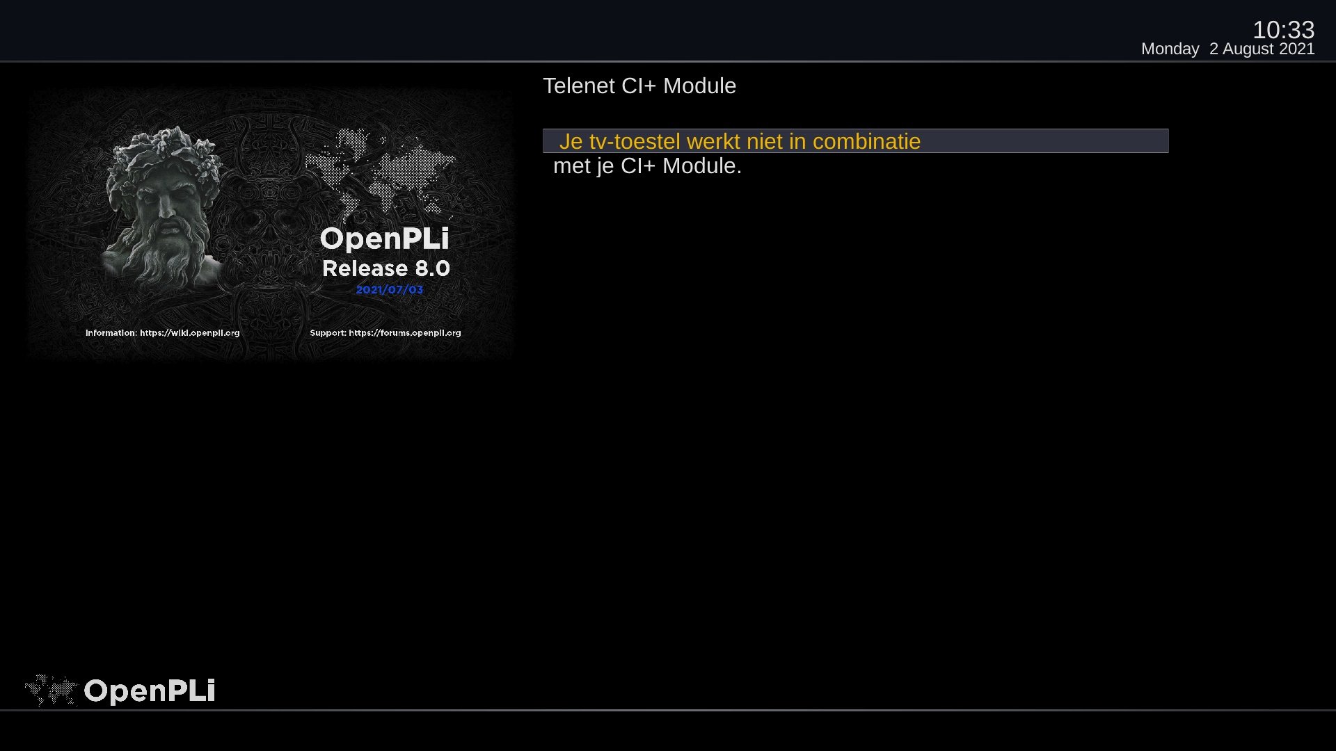 Zilverhippie Geplaatst: 2 augustus 2021 Geplaatst: 2 augustus 2021 Ik gebruik al een tijdje VTi om mijn SmarDTV CI+ module van Telenet te gebruiken i.c.m. een Vu+ Duo2. Ik maak echter toch liever gebruik van OpenPLi, maar lees her en der (ook op dit forum) dat CI+ en OpenPLi niet (meer) samenwerken. Out of the box - op een maagdelijke OpenPLi image - is dit ook zo, maar ik wou hier graag delen hoe het toch mogelijk is om een CI+ module van Telenet werkend te krijgen op een receiver met OpenPLi. Het zou handig zijn mocht je laten weten welke receiver/module-combinatie jij aan de praat kreeg op OpenPLi. Hoewel ik hiermee bevestig dat dit nu werkt, is het vanzelfsprekend geen garantie dat dit ook zo zal zijn in de toekomst. Al wat je nodig hebt is een plugin die te downloaden is op github.com/Ednaz/e2binary, maar lees eerst verder hieronder omdat de plugin mogelijks eerst een kleine aanpassing op jouw ontvanger vereist. Het zou moeten werken op de ontvangers uit het lijstje hieronder waarvan ik persoonlijk de werking op de Vu+ Duo2 kan bevestigen i.c.m. OpenPLi 8.0. Ook nog even vermelden dat dit niet werkt op een Vu+ Duo 4K SE. gi et11000 formuler4turbo gbquad4k gbue4k lunix3-4k lunix4k vuduo2 vuduo4k vusolo2 vusolo4k vusolose vuultimo4k vuuno4k vuuno4kse vuzero4k Om de plugin foutloos zijn werk te laten doen heb je de juiste versie van de functie 'wget' nodig. Op mijn Vu+ Duo2 staat standaard de BusyBox-versie (een light-versie met minder opties) waardoor de plugin bij mijn eerste pogingen de mist in ging. Zoek het ip-adres van je ontvanger op en start een Telnet-sessie opkg update opkg install wget Nu zou alles goed moeten zijn om de plugin te installeren via een Telnet-sessie of lokaal via de ontvanger. Zet de plugin eerst op een toegankelijke locatie, bijv. op een USB-stick. Mijn voorkeur gaat naar een Telnet-sessie omdat je bij eventuele fouten direct de foutmeldingen ziet: opkg install /media/usb/enigma2-plugin-systemplugins-ciplusinstall_1.8-r1-openpli_7.0-release_7.1-release_7.2-release_8.0-release_all.ipk Lokaal installeren met de afstandsbediening kan ook: MENU-toets > Applicaties > Softwarebeheer > Installeer plugins lokaal > /media/usb > Installeer applicaties > selecteer de plugin, vink aan en installeer met de groene toets. Na installatie van de plugin wordt de ontvanger automatisch herstart. Als je vervolgens een kanaal selecteert dat de CI+ module nodig heeft om het signaal te decrypteren wordt de module gekoppeld met de ontvanger. 2