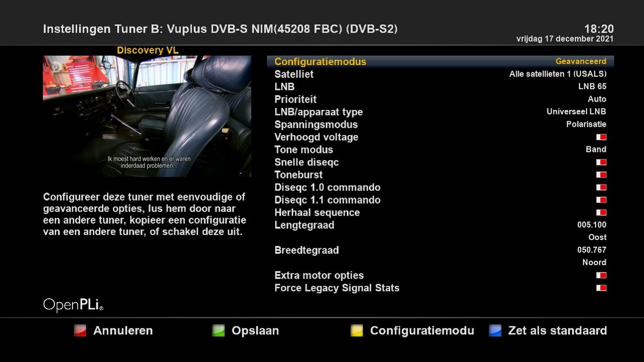 janneke Geplaatst: 17 december 2021 Auteur Geplaatst: 17 december 2021 @smetje limb.BE De rotor is via de DISEqC verbonden met tuner A. Ik heb getest rechtstreeks met de rotor (dus zonder switch) met tuner B. 5.891 Oost en 51.032 Noord is mijn locatie.