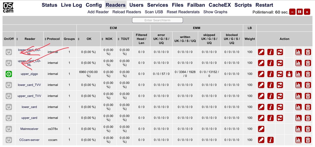 smetje limb.BE Geplaatst: 21 december 2021 Geplaatst: 21 december 2021 plaats deze eens in oscam server staat in etc...tuxbox... config dan naar oscam server ontvanger terug herstarten en ook je oscam herstarten en laat hem vb: rtl4 staan en heb eens even geduld...als je kaart natuurlijk een abo heeft moet het toch gaan werken ####################### Card ############################ [reader] label = upper_card enable = 1 protocol = internal device = /dev/sci1 #ecmwhitelist = 0100@00006A:64 #ecmheaderwhitelist = 800061006A00075C00,800061006A01075C00,803061006A00075C00,803061006A01075C00,810061006A00075C00,810061006A01075C00,813061006A00075C00,813061006A01075C00 detect = cd group = 1 emmcache = 1,3,15 audisabled = 0 mhz = 357 cardmhz = 2700 ratelimitecm = 4 ratelimittime = 10000 ecmunique = 1 srvidholdtime = 2000 cooldown = 30,600 [reader] label = lower_card enable = 1 protocol = internal device = /dev/sci0 #ecmwhitelist = 0100@00006A:64 #ecmheaderwhitelist = 800061006A00075C00,800061006A01075C00,803061006A00075C00,803061006A01075C00,810061006A00075C00,810061006A01075C00,813061006A00075C00,813061006A01075C00 detect = cd group = 1 emmcache = 1,3,15 audisabled = 0 mhz = 357 cardmhz = 2700 ratelimitecm = 4 ratelimittime = 10000 ecmunique = 1 srvidholdtime = 2000 cooldown = 30,600 #[reader] #label = Card_Blanca #enable = 0 #protocol = internal #device = /dev/sci0 #services = canal+ esp #caid = 1810 #ecmwhitelist = 1810@1F1F1F:89 #detect = cd #nagra_read = 2 #mhz = 500 #cardmhz = 368 #ident = 1810:000000,004001,004101 #group = 3 #emmcache = 1,3,2,0 als op oscam server staat klik met je rechtse muisknop en dan bewerken Dreambox 900UHD 4x twin lnb 1x bosat 1.50m .Dreambox 7020hd v2 Dreambox 800 Dreambox 8000 Dreambox 800se Dreambox 500HD Sab unix triple Xsarius Galaxy 4K gigablue trio Gigablue HD Quad Plus Zgemma H7 Cabel en Sat Samsung UE65MU7070 4K Ultra HD Smart LED Samsung UE46F6650SSXXN led 1x LG 60"lb 870v